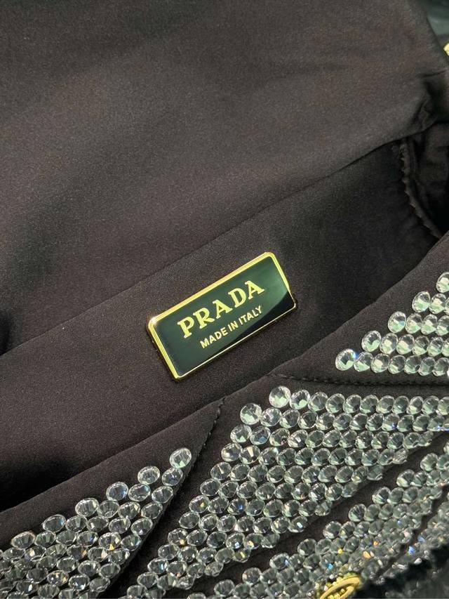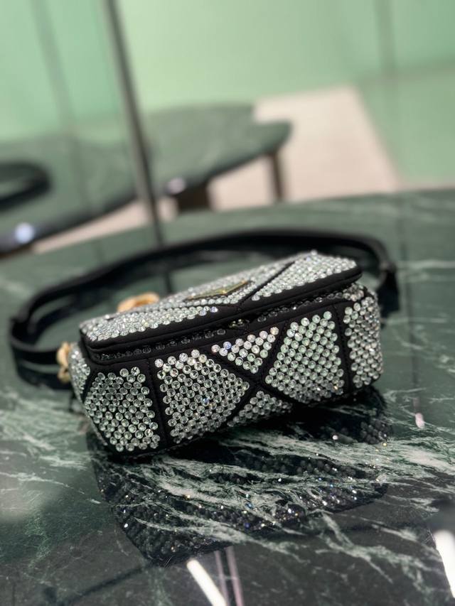 这款采用通体仿水晶和缝线,华美间面线于此款迷你手袋勾勒三角形图案,映现品牌匠心工艺。链条提手设计引人联想珠宝世界。闪亮元素跃于包身,金属三角形徽标点缀正面。