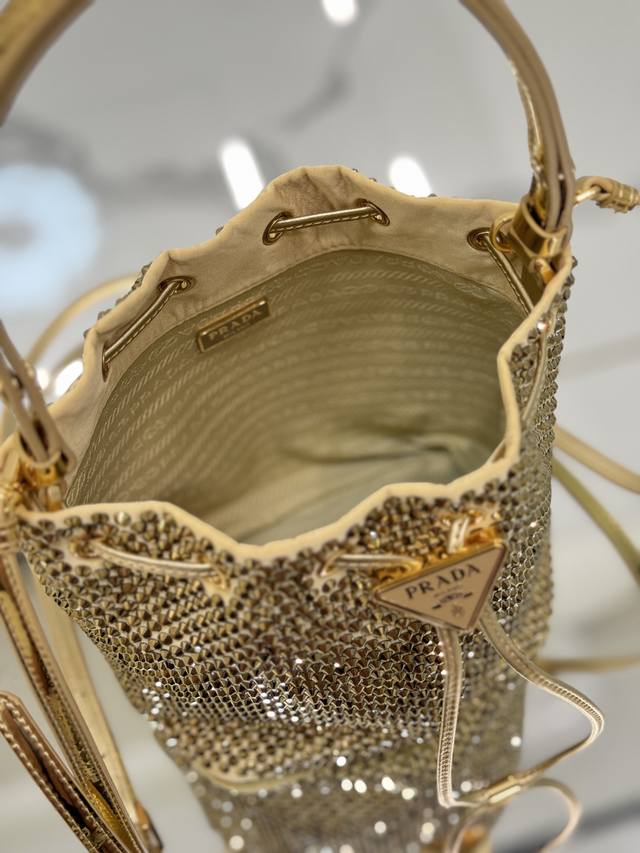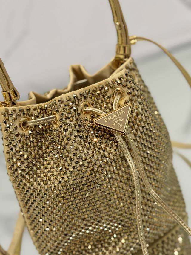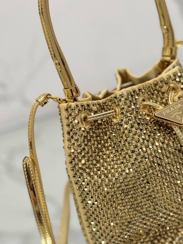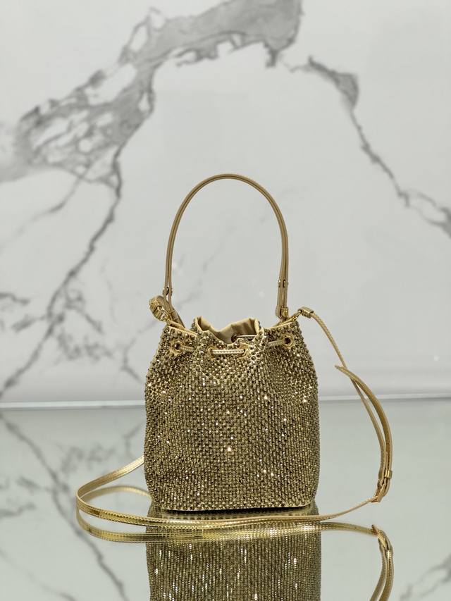 这款水晶水桶采用进口仿水晶和缎面材料组合,涂珐琅金属三角形徽标装饰开合设计。短肩带可调节长短,长肩带可拆卸可调节。太闪了!Bling Bling的效果非常吸眼,容量空间大。