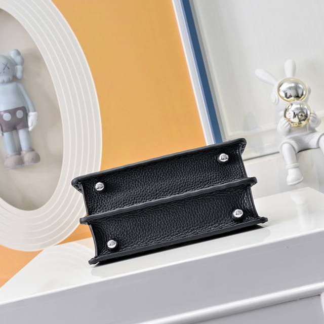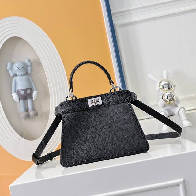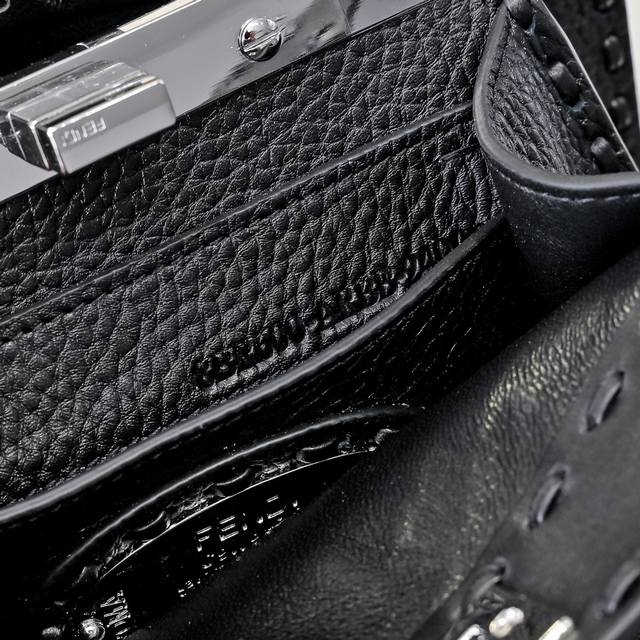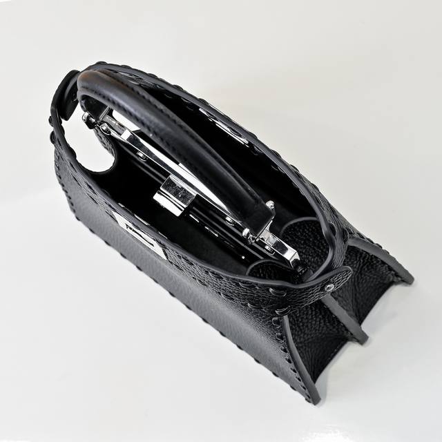 细节:黑色手缝,Peekabooiseeu中号手袋,荔枝纹小牛皮材质,两侧缀以经典的扭锁,软纳帕皮革衬里,两个隔层由硬质隔板隔开,配有系扣内部口袋和金色金属件。手袋配有手柄和可调节、可拆卸式肩带,精緻又耐看的包包