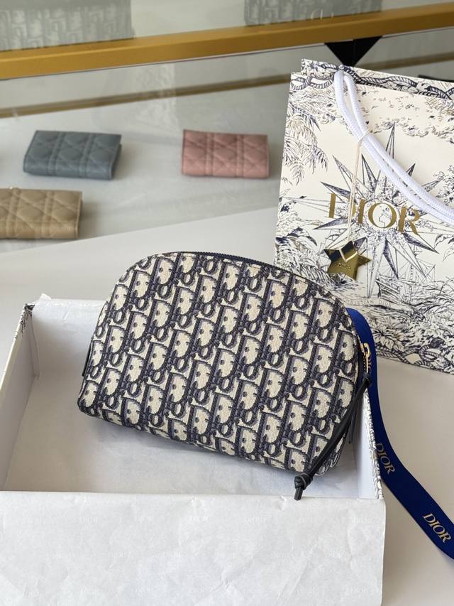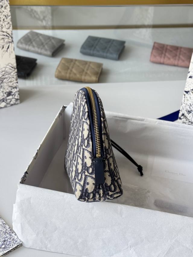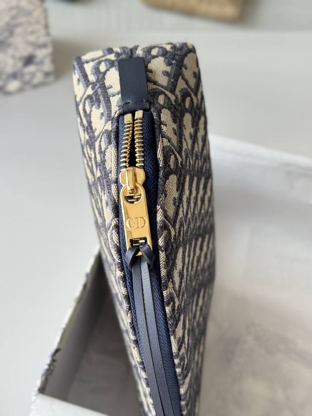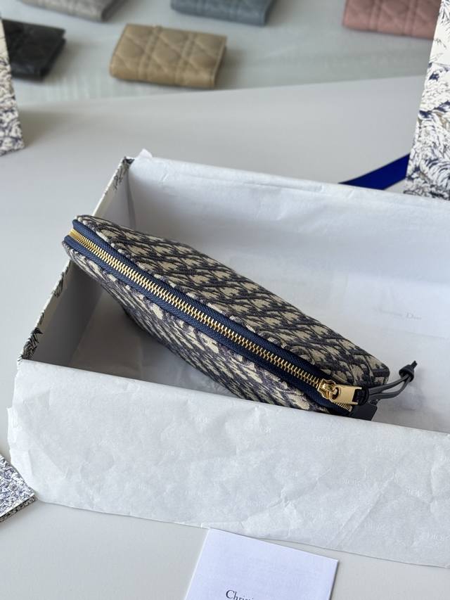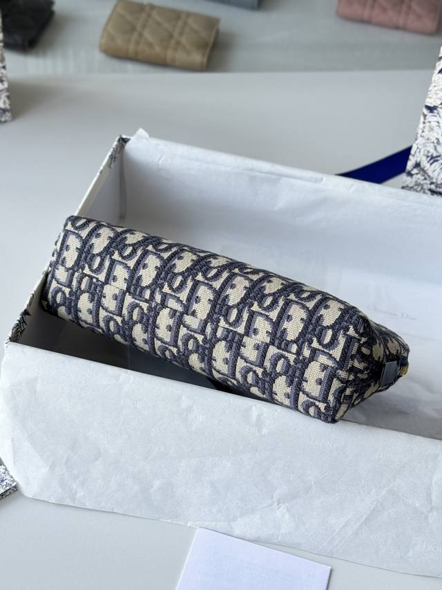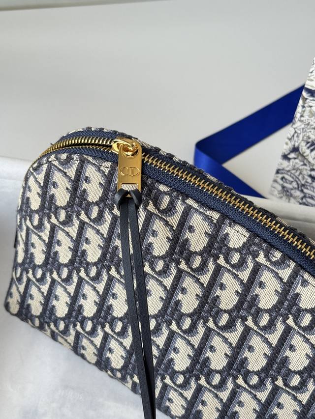 这款包饰有Dior 标志性的蓝色Oblique 印花。带有两个别致的拉链开合隔层和一个贴袋,可收纳各式用品。大号款式,可与其他 Oblique 印花单品搭配使用。正面Cd标志