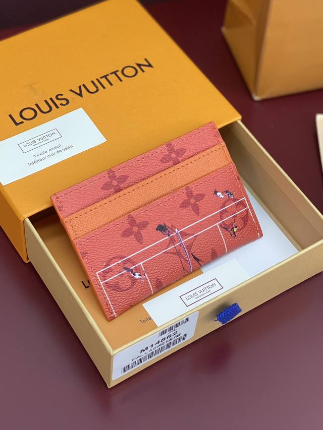 出厂价P M14862 卡片夹!网球橙色!Double 卡夹、本款 Double 卡夹出自父亲节系列,为 Colored Monogram 帆布融入袖珍运动场景印花,以牛皮革内衬完善经典格调。卡片夹层和中央口袋实现有序收纳。