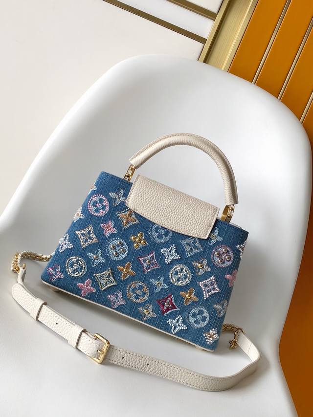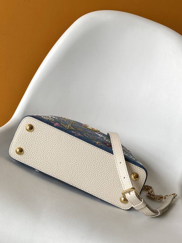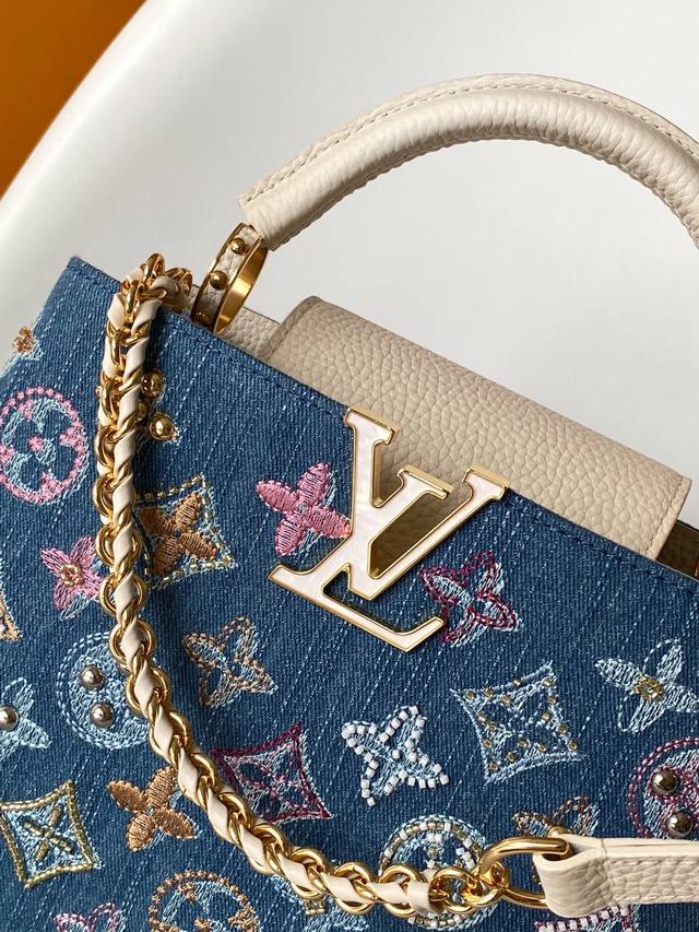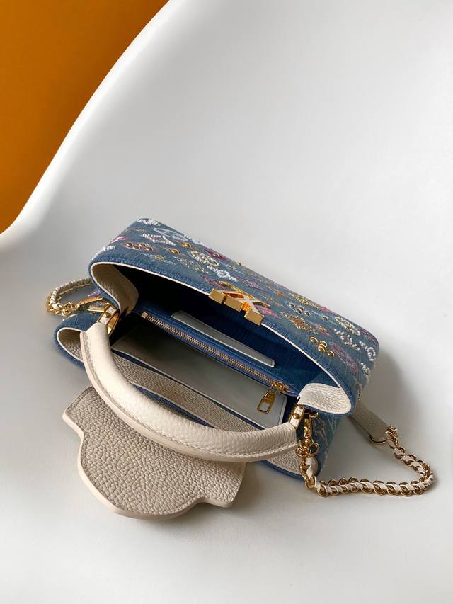 M12947大号 特级原厂 动态163 本款 Capucines 迷你手袋为 Monogram 丹宁布刺绣串珠和装饰线,以 Lv 字母和编织链条注入金属锋芒,搭配撞色皮革饰边。翻盖可外置或内收,齐整内层和多种背携方式完善功能细节。