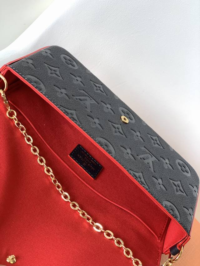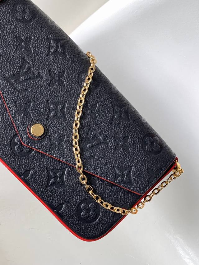 本款 Pochette FéLicie 链条包采用 Monogram Empreinte 皮革塑造信封式构型,以压纹工艺呈现经典 Monogram 图案。充裕隔层配有可拆卸拉链袋和卡位,可拆卸链条带来多种背携方式,契合当代摩登生活。21.0 X 12.0 X 3