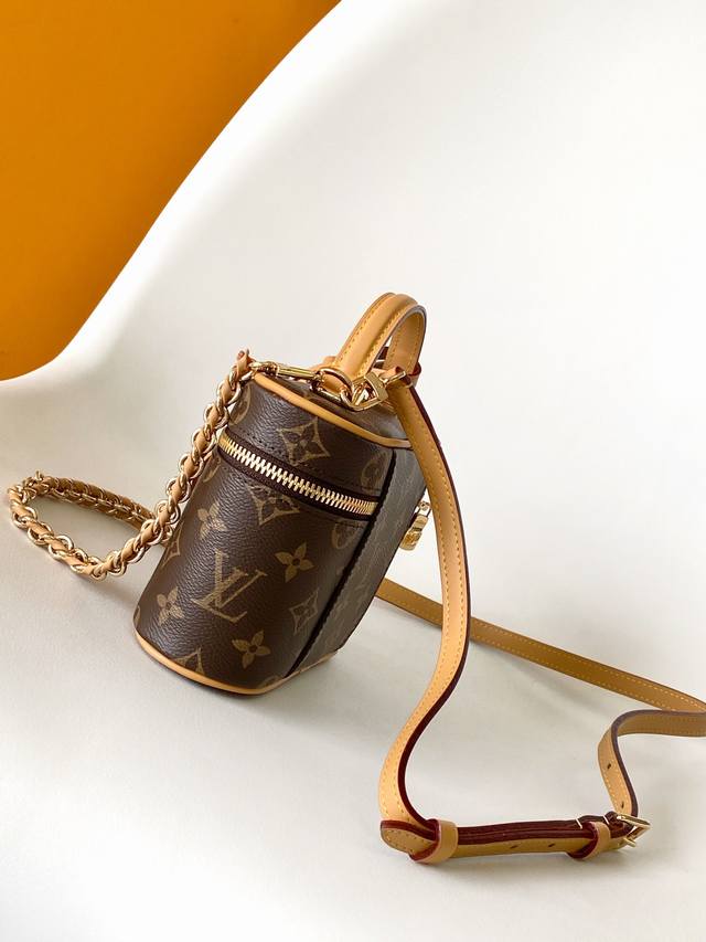 Pm47125黄皮顶级原单Vanity Chain Pouch 化妆手袋]M47125 黄色Vanity Chain Pouch 手袋向经典化妆箱汲取灵感,以Monogram 帆布诠释旅行精神。顶部手柄和可拆卸编织链条融入皮革元素,与包身的简明线条相互映衬。Iv铭纹挂锁和皮革钥匙包延续标志性细节。