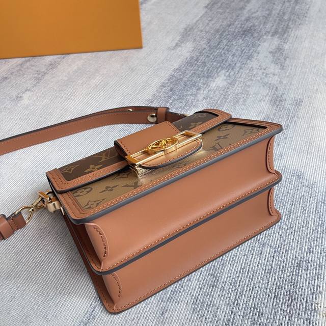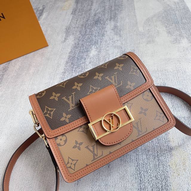 头层皮M45958本款中号手袋 M44391路易威登经典 Dauphine 手袋系列新作:来自 早春系列,出自女装艺术总监 Nicolas GhesquièRe 之手的改良版设计。将 Monogram 帆布与 Monogram Reverse 帆布相结合,配有链带与磁扣,以摩登风格展现品牌传统,尽显路易威登时尚禀赋。尺寸:25.0 X 17.0 X 10.5 厘米 长 X 高 X 宽