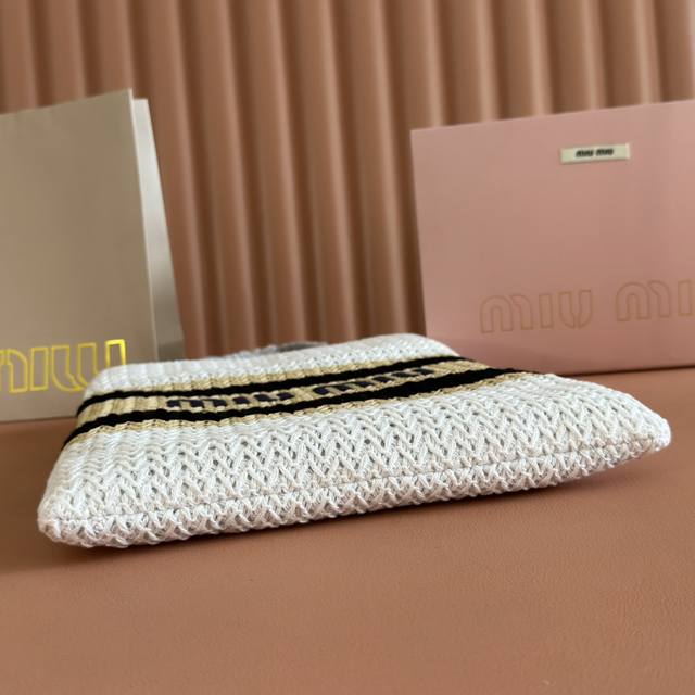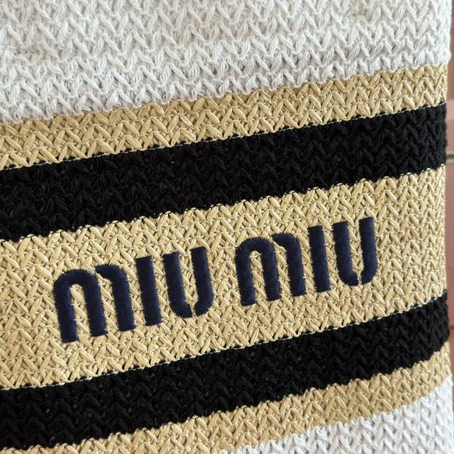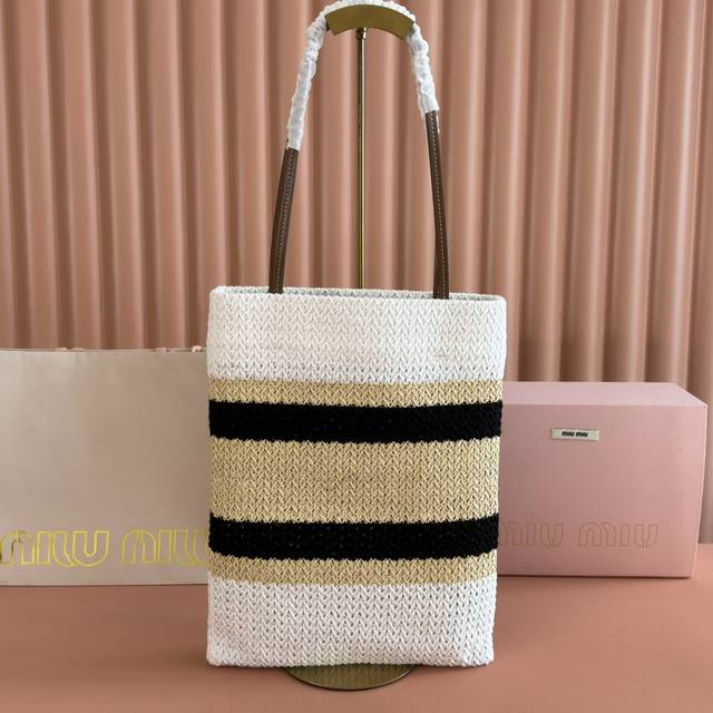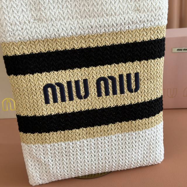 配置专柜全套包装 M家 5Bg248,进口拉菲草编拼绵线编织托特包,这款钩针编织托特包饰以活力的色彩拼接图案,包身饰以标志性的Miu刺绣徽标,与复古和精致做工共