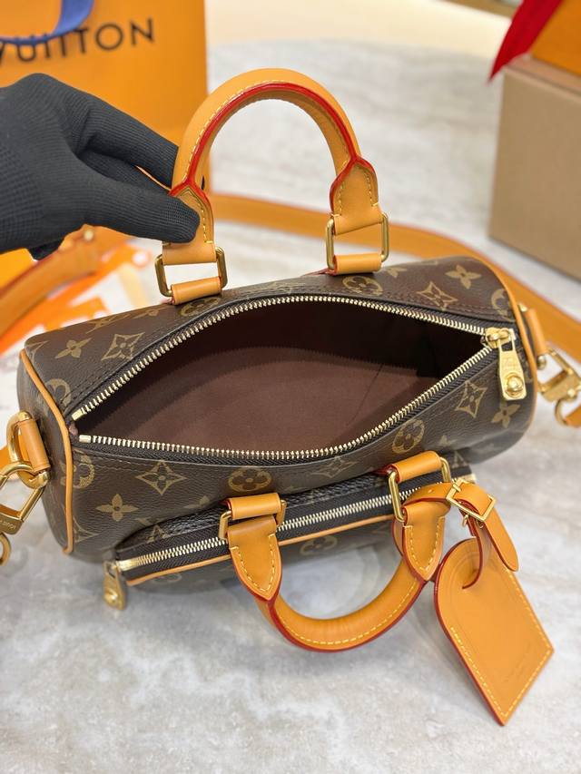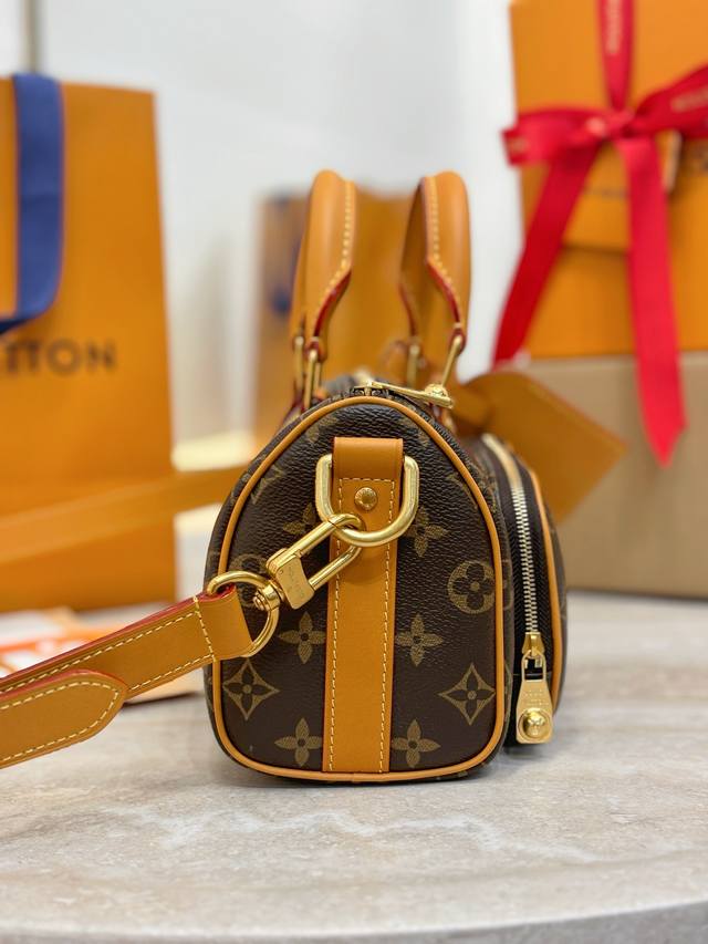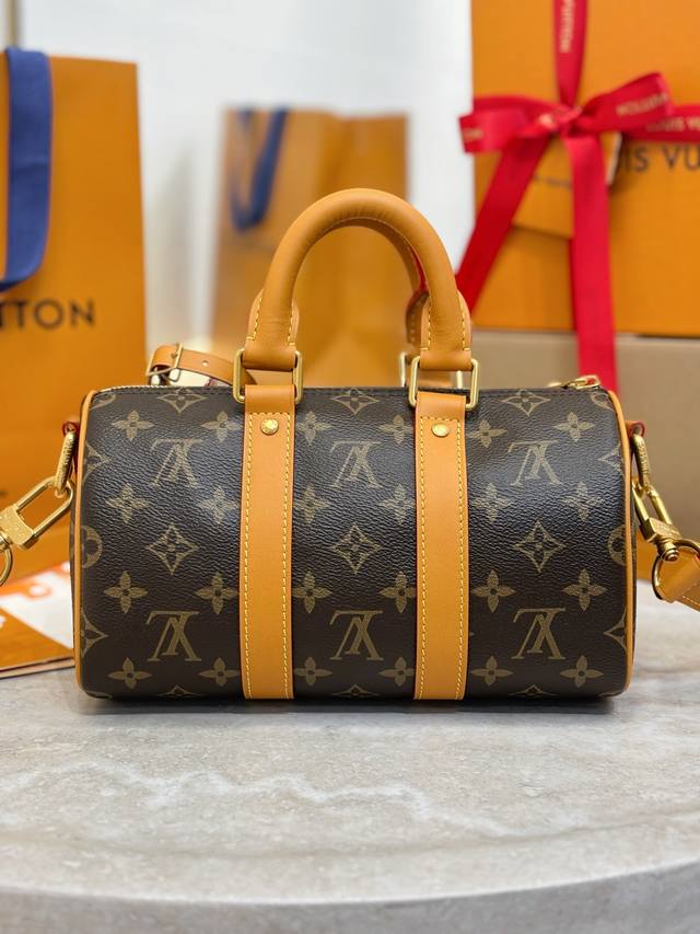 本款 Keepall 25 Cargo 手袋出自 Monogram Archive 系列 为 Monogram 帆布搭配做旧牛皮革饰边 娓娓道出复古格调 金属质感珠饰拉链头与可拆卸皮革名牌彰显品牌匠心细节 正面拉链口袋与主隔层再添功能考量 Size:25X15X11Cm