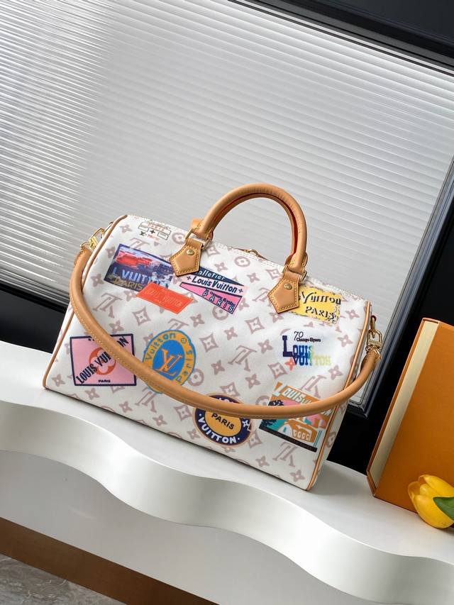 对版带飞机 本款 Speedy Soft 30 手袋以复古笔触演绎 Monogram Dune 元素,搭配飞机造型装饰和拼贴效果标签,致意 Gaston Louis Vuitton 典藏系列设计。长款手柄便于肩背,成就又一旅行佳伴。30.0 X 21.0 X 17.0 厘米 长 X 高 X 宽