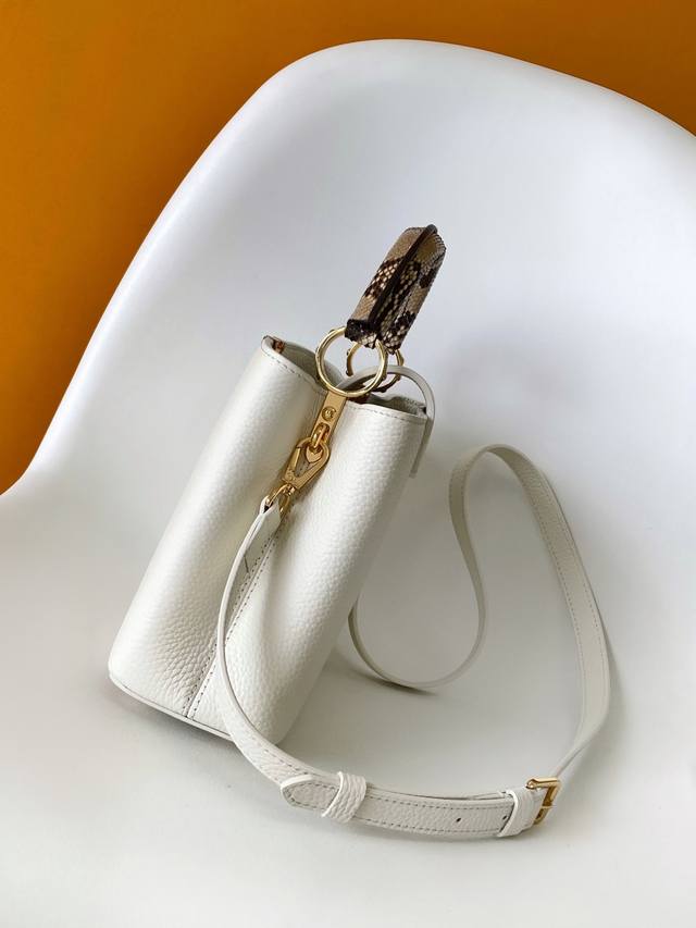 N85515白色 N85514黑色 特级原厂 动态163 夏季款 Capucines 迷你手袋取材 Taurillon 牛皮革,再以华美蟒蛇皮革包裹手柄及 Lv 字母,为标志性设计融入异域风情。可拆卸肩带实现舒适肩背或斜挎体验。
