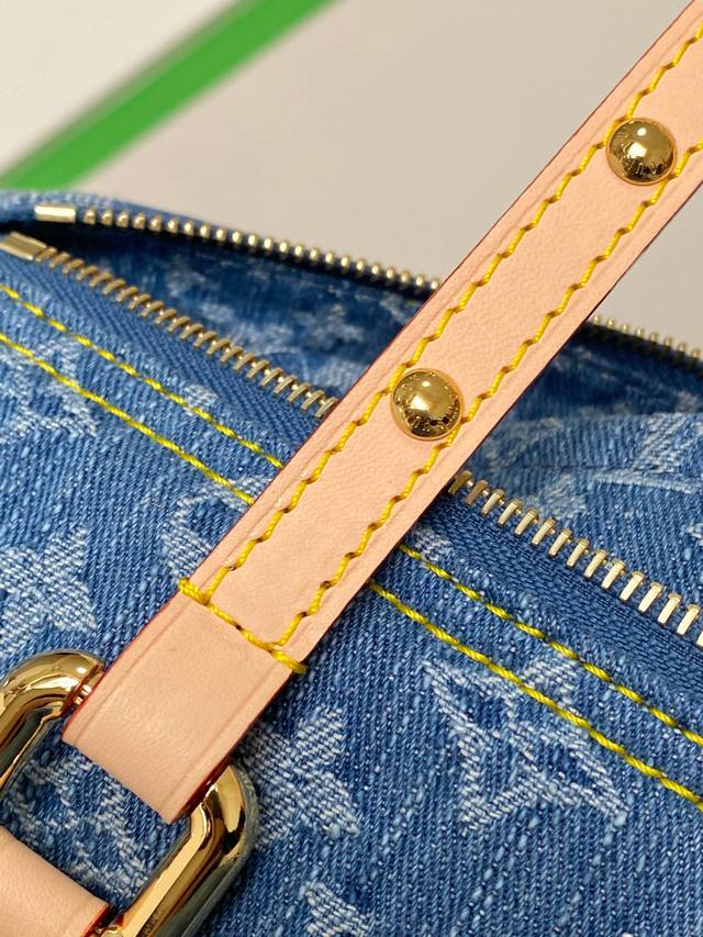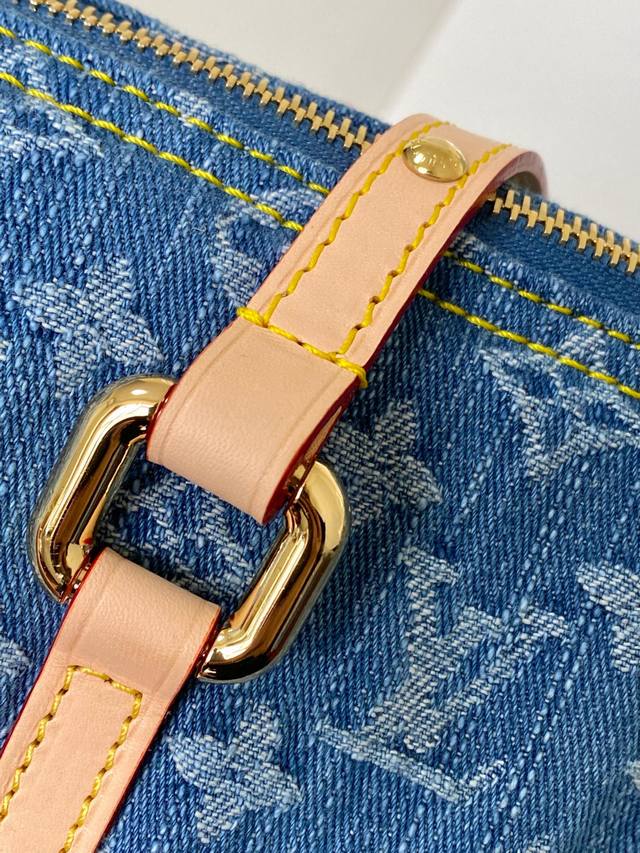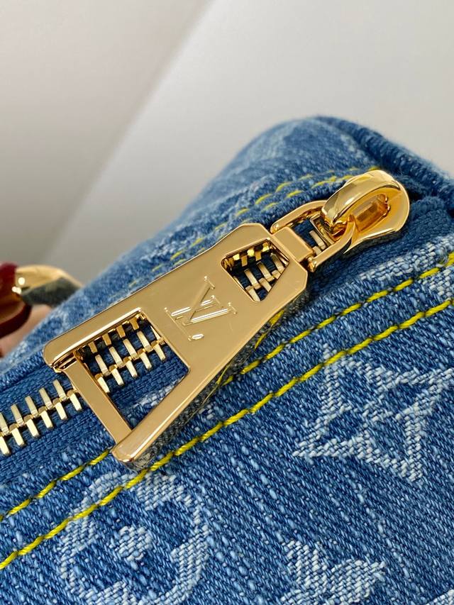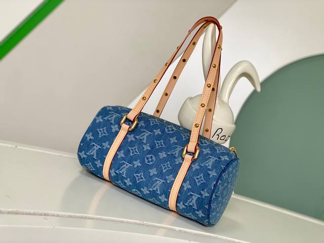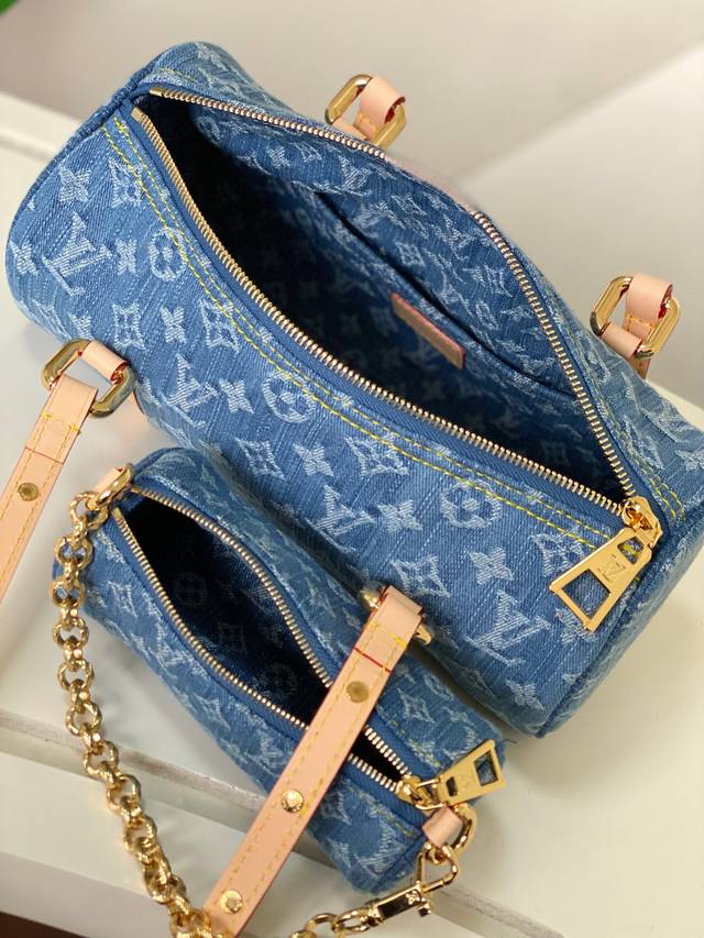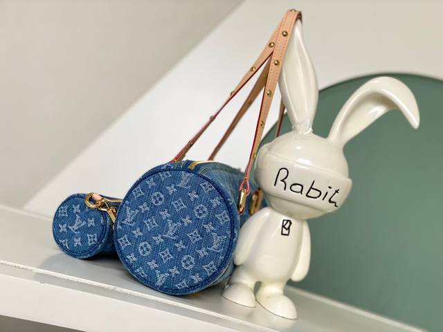本款 Papillon 手袋取材多重工艺制成的 Monogram Denim 帆布,与同款手袋的微缩版本相映成趣。棉纱织就 Monogram 图案后进行漂白,成品的砂洗处理营造别致观感。27.0 X 11.0 X 13.0 厘米 长 X 高 X 宽