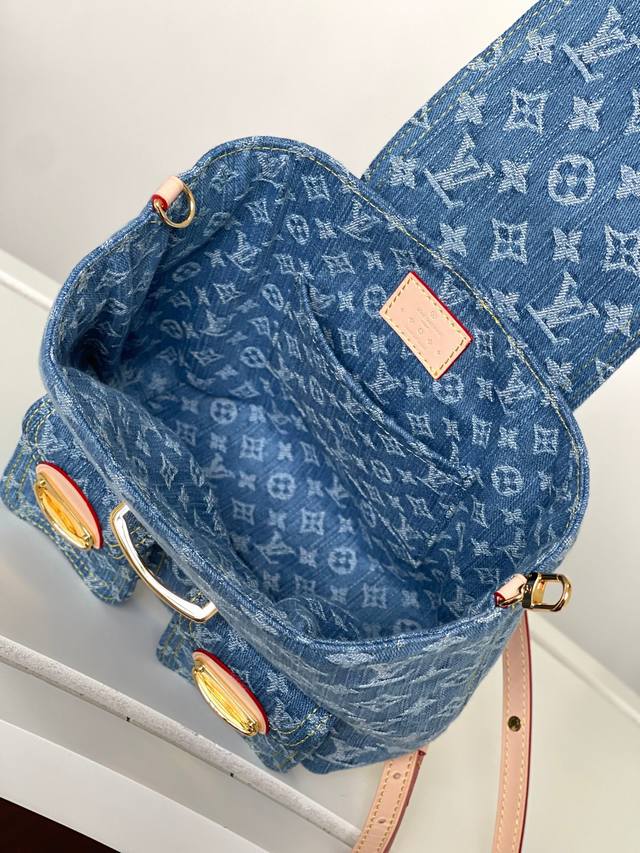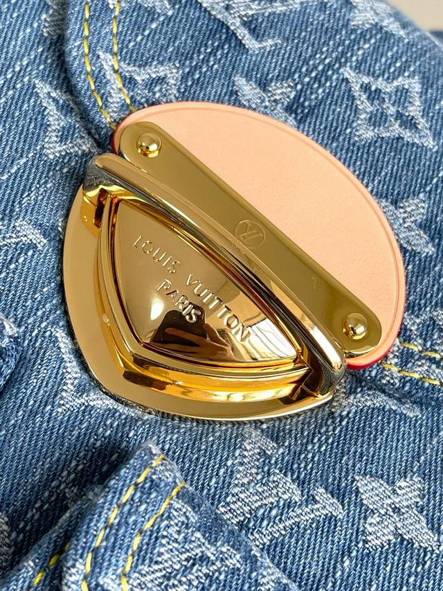 海原外单 独实家拍 M46836丹宁双肩包系列 Venice 双肩包,这个小背包包,威尼斯,是由会标牛仔布。它有三个金色的锁扣,一个在翻盖上,一个在两个外面的前口袋上。足够大的日常必需品,它适合Iphone 14 Pro Max、钥匙、钱包、耳塞和太阳镜盒。24X26X7厘米 长X高X宽
