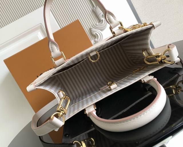 本款 小号手袋焕新品牌经典 皮革,以相同色调勾勒图案轮廓。可拆卸金属链条装饰点亮细节,条纹织物内衬释放优雅气息,可拆卸肩带实现肩背或斜挎。