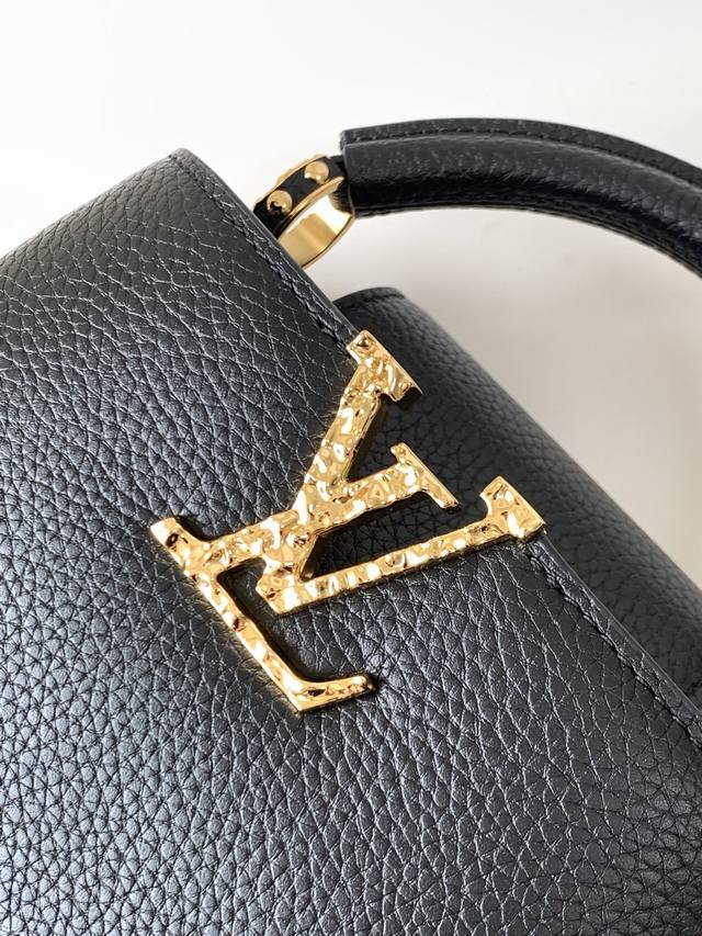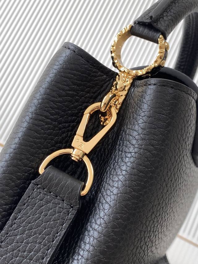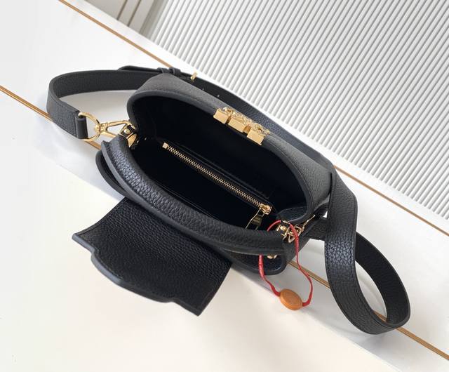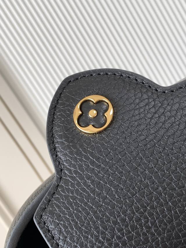 本款Capucines East West迷你手袋为粒面牛皮革点缀Lv 字母,以雅致构型囊括隔层、拉链口袋和贴袋,便于收纳手机、短款钱夹等随身小物。可拆卸并调节的肩带解锁肩背体验。详细特征