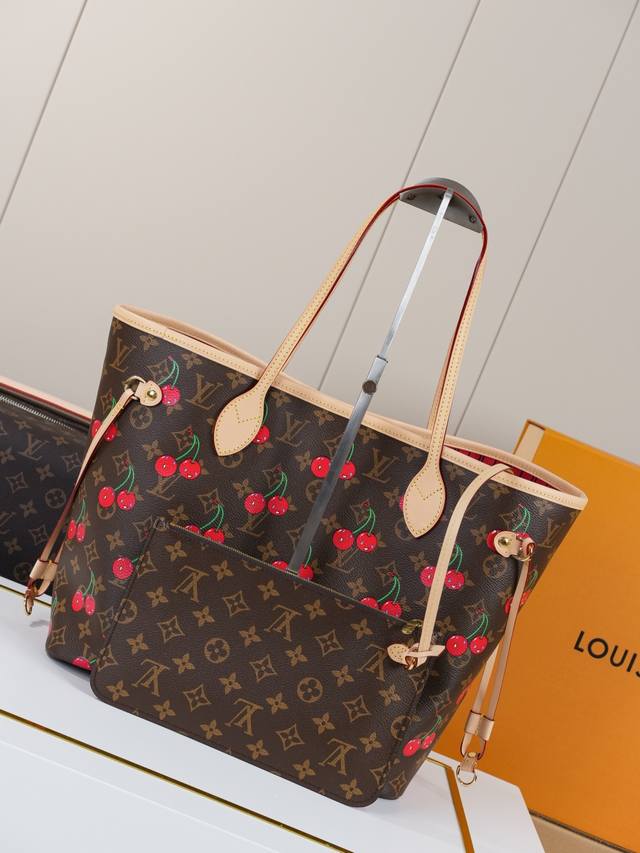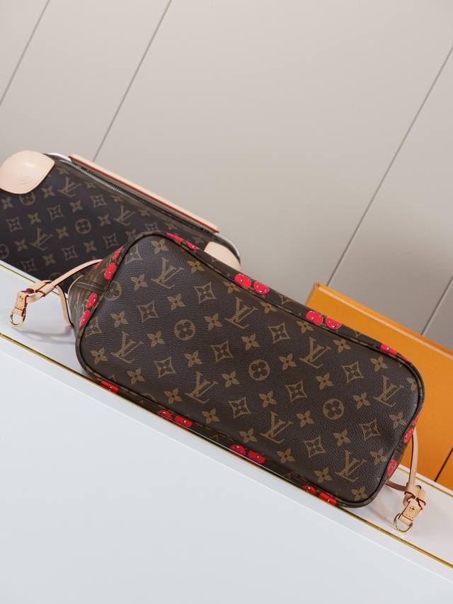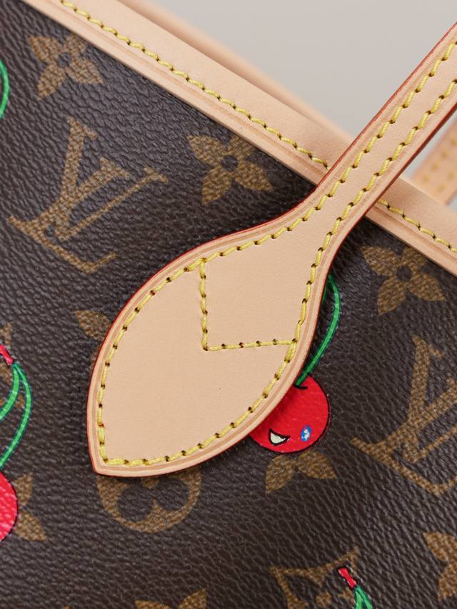 动态163C01芯片 M13263樱桃 顶级原单 独家背景实拍 本款 Neverfull 中号手袋以灵动笔触重绎路易威登 X 村上隆复刻系列的欢快元素,令甜美樱桃图案栖身于 Monogram 涂层帆布,与醒目条纹内衬共同道出艺术家标志性的色彩美学。牛皮革饰边完善经典格调。