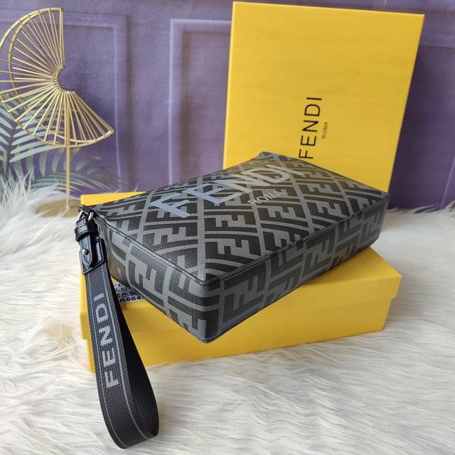 / 款号7Va564黑色丝印手包,设有内部隔层,配拉链开合,卡夹和可拆卸织带手镯式手柄。尺寸:27Cm-18Cm-5Cm