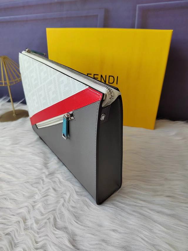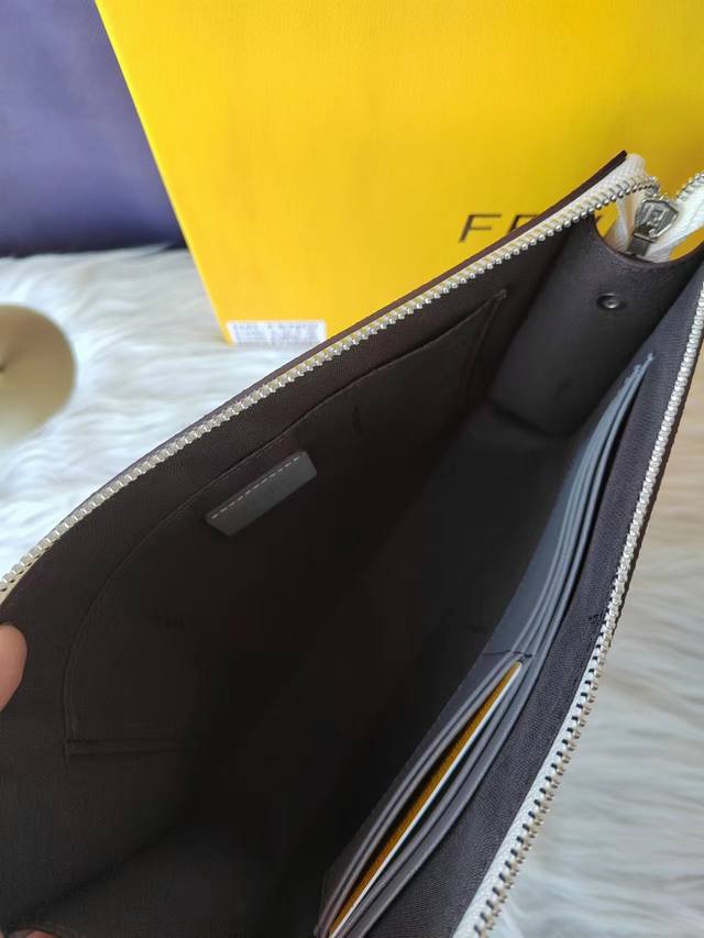 款号F7Va491面料白色配灰色,手拿包搭配可拆式链条提手,内有卡片套,正面配搭带拉链的斜对角口袋,拉链开合。尺寸27Cm-20Cm-6Cm