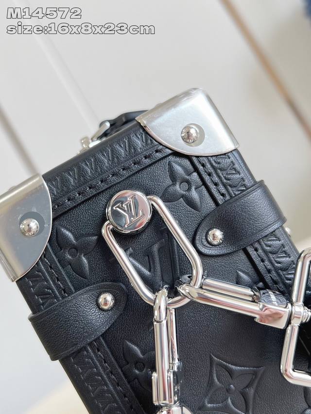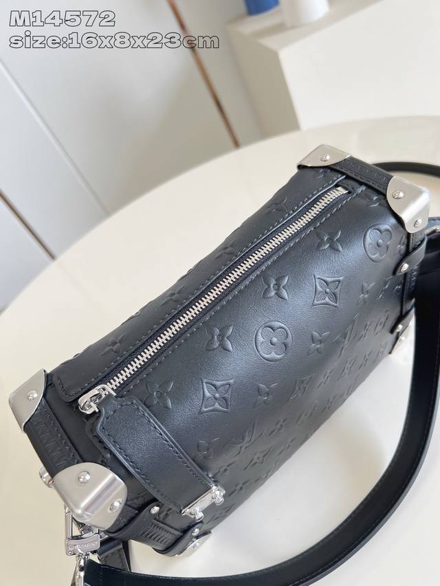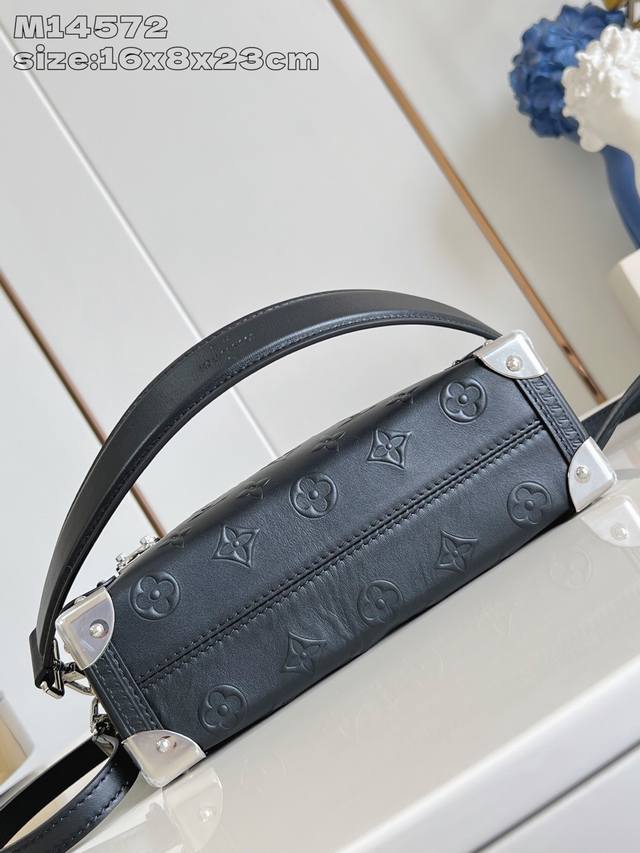 顶级原单 独家实拍 M14572 本款 Side Trunk 中号手袋出自 Monogram Bold 系列,展现艺术总监 Nicolas GhesquièRe 对路易威登经典行李箱的创意诠释。光滑牛皮革包身压印 Monogram 图案,金属包角和 S-Lock 锁扣彰显标志性笔触,可拆卸长肩带实现灵活背携。16 X 8.5 X 23.5厘米 高 X 宽 X 长度