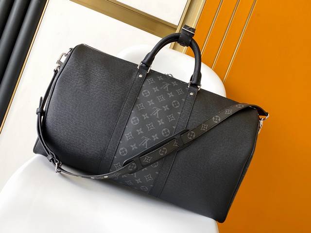 变码芯片版 M53763 M30235 黑色 Keepall 50旅行袋 配肩带 质地柔软、风格优雅的原创Keepall旅行袋,十字纹配花料旅行袋标志性Taiga皮革材质,时尚而实用的周末休闲伴侣。 Size:50*29*23
