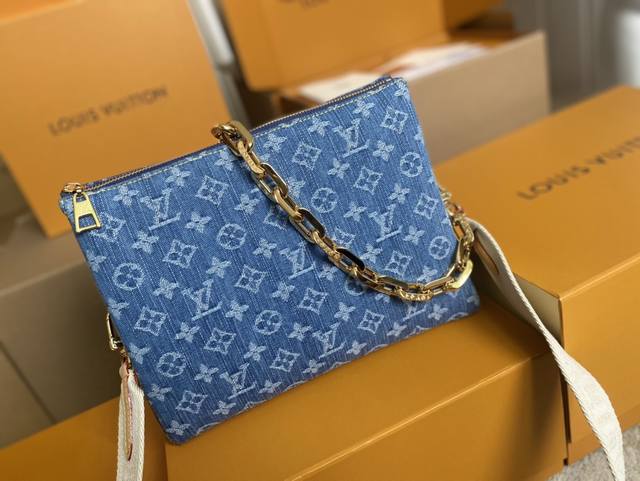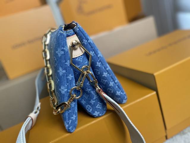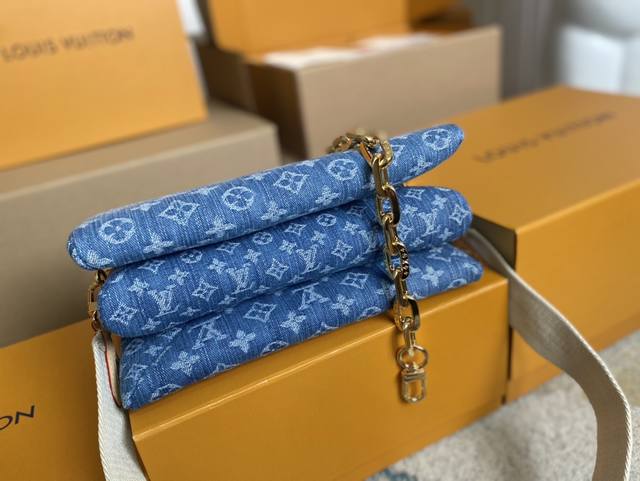 / 顶级原单 M24564 牛仔兰本款 Coussin 小号手袋以新季棉质丹宁吹袭清逸气息,依托漂白和砂洗工艺成就别致观感。搭配可拆卸铭纹粗链条和宽幅织物肩带,轻盈