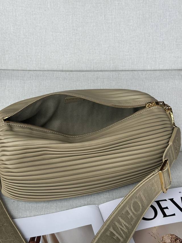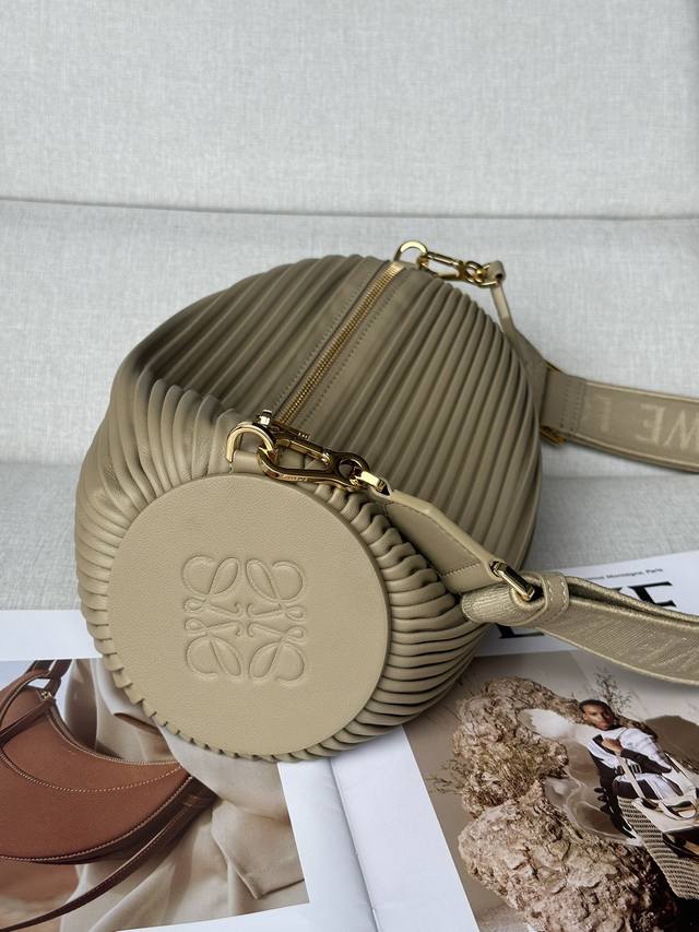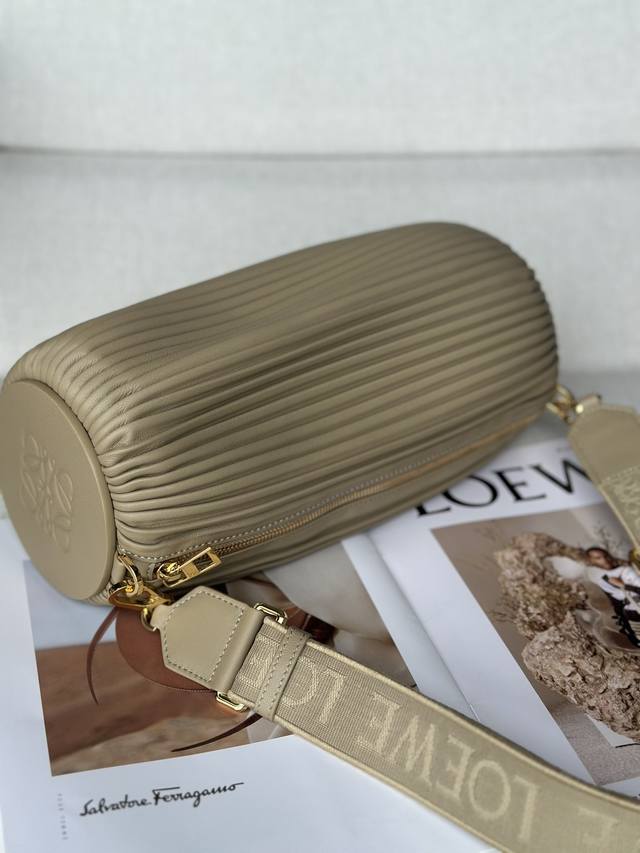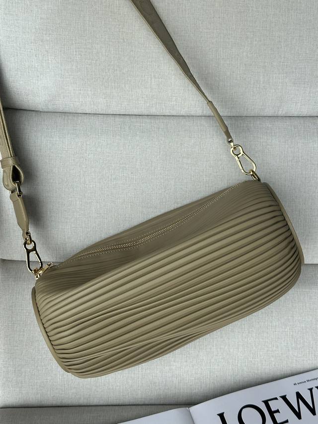 多功能管状小包,采用褶皱纳帕羊皮革制成。此版本版本同色系提花肩带,两端饰有同色系皮革铭牌。