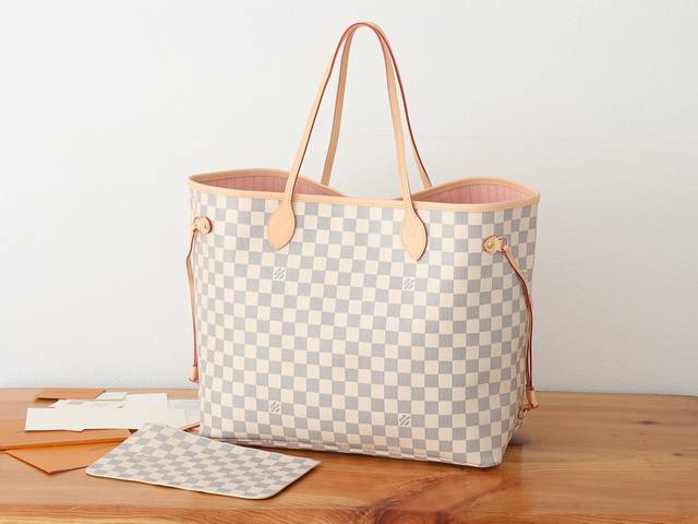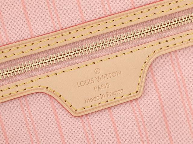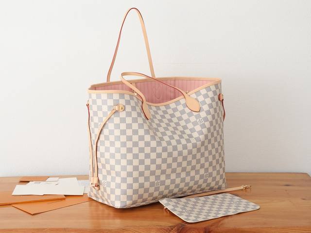 变码芯片版顶级原单、加强版Neverfull 大号托特包为 Damier Azur 帆布勾勒牛皮革饰边,于宽敞构型融入缤纷织物内衬。两侧饰带无论束紧或舒展,均可展现别样风采。纤细手柄方便肩背或肘挎,可拆卸拉链袋可用作手拿包或口袋。型號:N40601 N41604 白格粉 尺寸:39 X 32 X 19 厘米 长度 X 高 X 宽