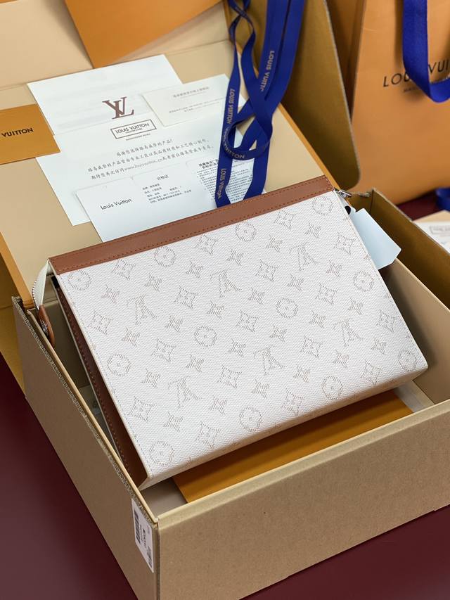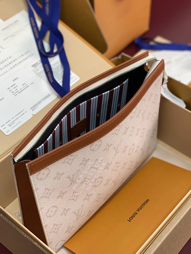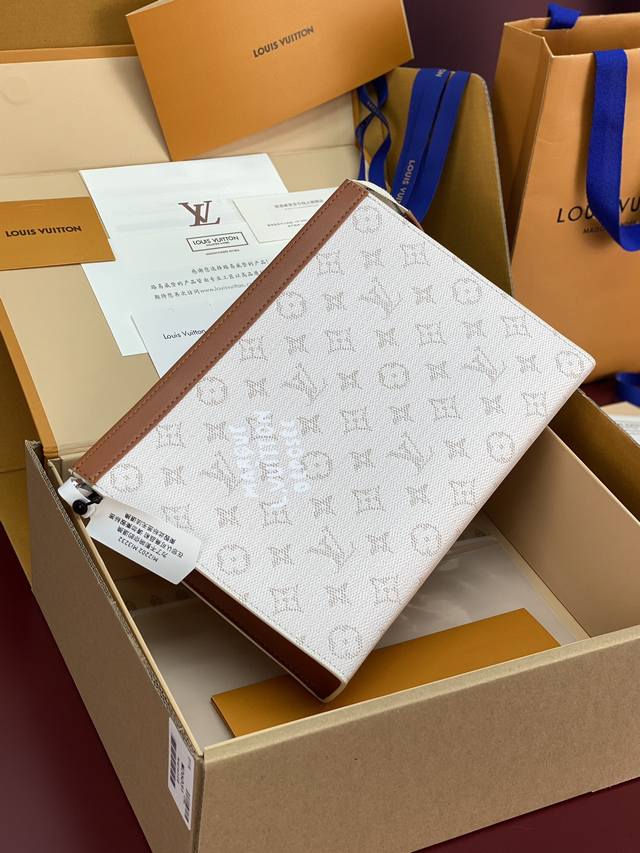 出厂价P 升级版本M61692 白条纹!芯片版!Monogram Heritage 涂层帆布包裹印花牛皮内胆!主题焕新 Pochette Voyage 手袋设计
