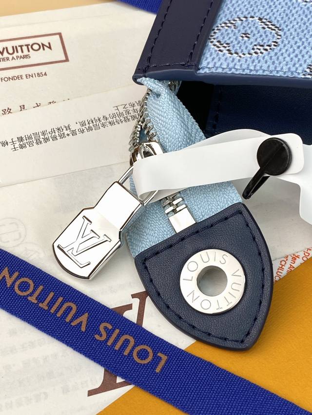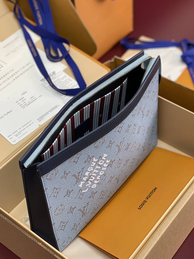 出厂价P 升级版本M61692 蓝条纹!芯片版!Monogram Heritage 涂层帆布包裹印花牛皮内胆!主题焕新 Pochette Voyage 手袋设计