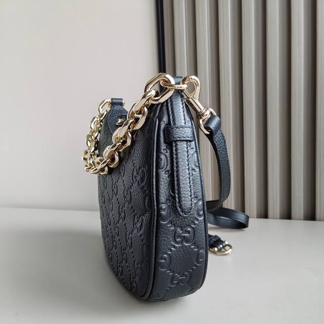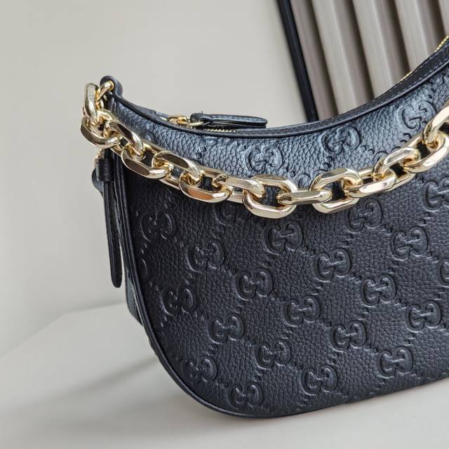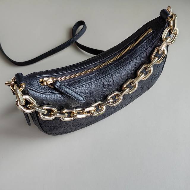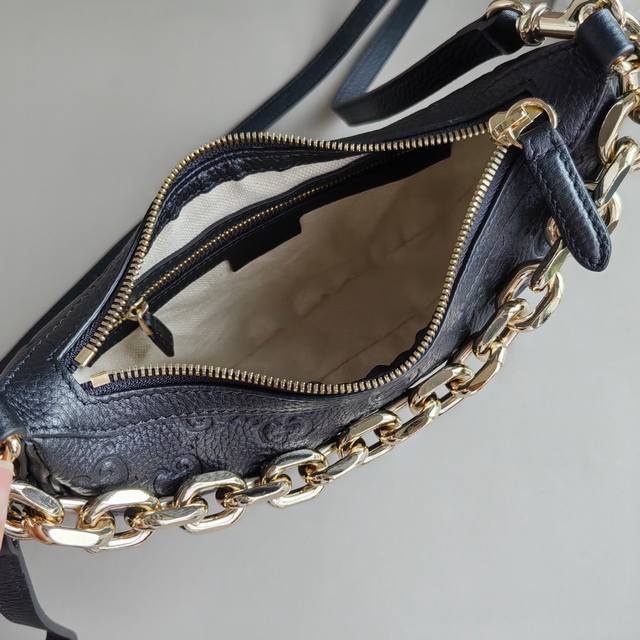 顶级原单 型号:815409 尺寸:25.5 20 5 Gg Emblem系列以创意设计和创新功能焕新诠释经典图案,匠心缔造未来数年的珍藏之选。这款小号半月形包焕新演绎品牌全新标志性单品系列,精心配设一条浅金色调链式肩带,另随附一条皮革肩带,可供斜挎背携。黑色Gg粒面皮革浅金色调配件棕色棉麻混纺衬里本商品另配有皮革肩带内部:1个拉链袋链式肩带 15厘米高 拉链开合