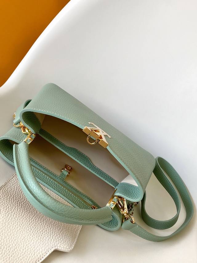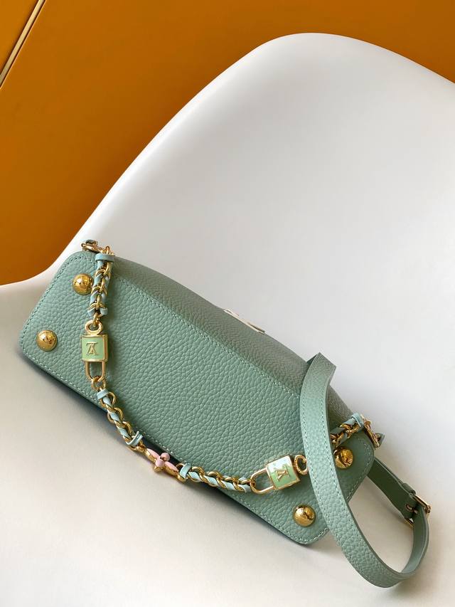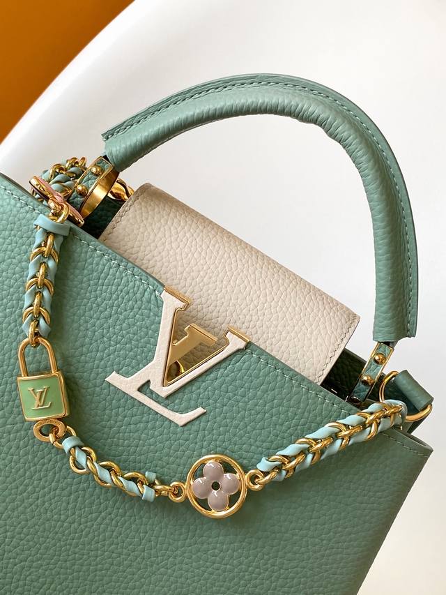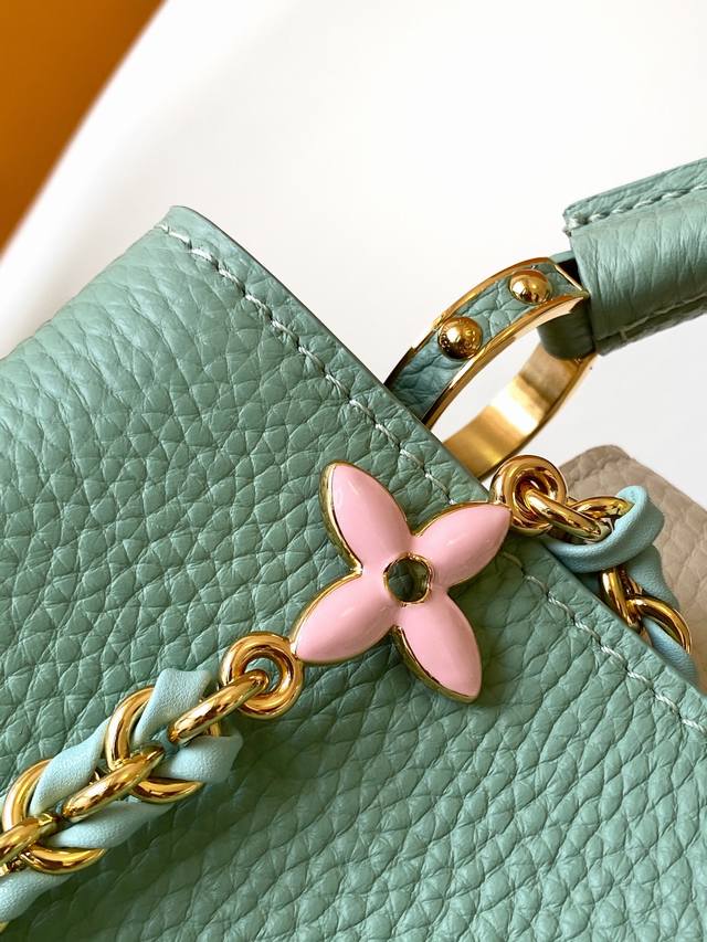 M23951粉色 M25339米白M23950黑色M11343纯白配粉 M25386黑配白 M23952白配蓝 M24471绿色 M22514白配黄 M22375秋水仙 M20845纯白 M20844蜜桃粉 特级原厂皮 动态变码芯片 本款 Capucines 迷你手袋为 Taurillon 皮革包身搭配华美 Lovelock 链条,以编织链环烘托手绘珐琅 Monogram 元素和 Lv 铭纹挂锁。皮革 Lv 标识再添瞩目光彩。26.5 X 17.5 X 9.0 厘米 长 X 高 X 宽 21.0 X 14