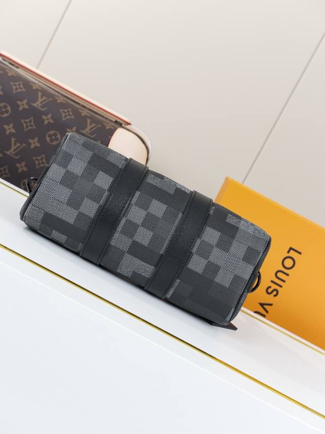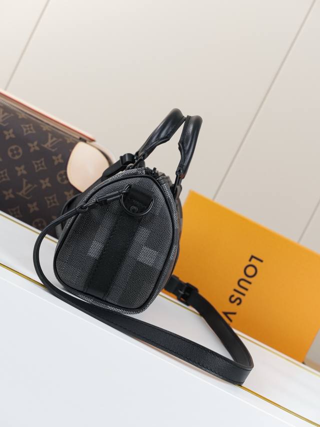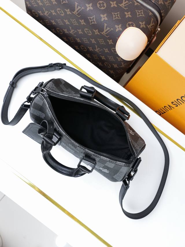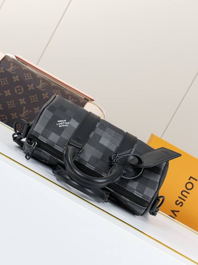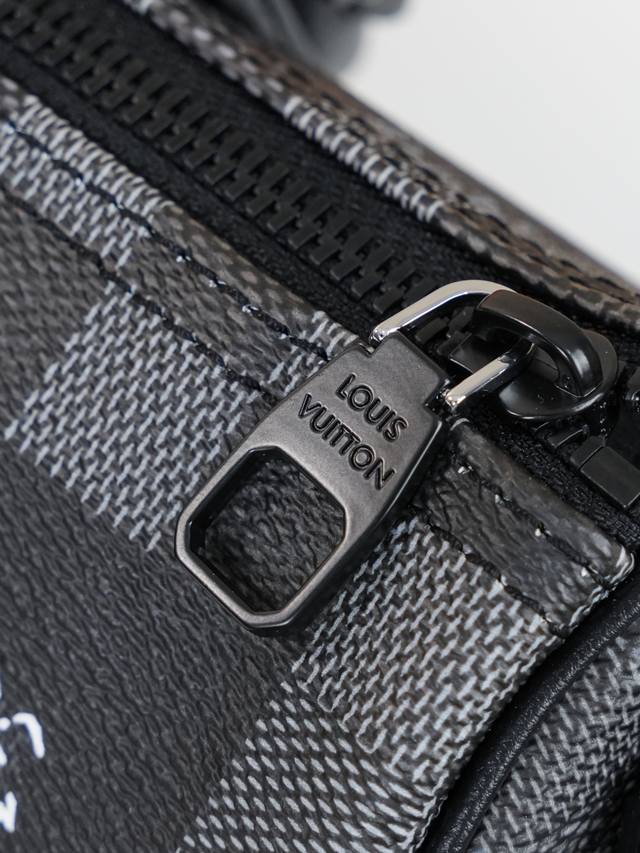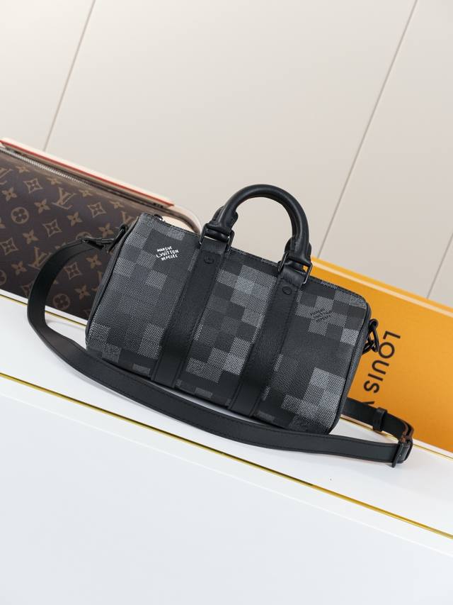 动态163C01芯片 M14919迷彩格 顶级原单 独家背景实拍 本款 Keepall BandoulièRe 25 手袋取材 Damoflage Black 涂层帆布,生动再现 Pharrell Williams 创意美学下的 Damier Graphite 图案。经典格纹呈现像素化效果,并以深邃色调营造别致迷彩外观。顶部手柄与可拆卸并调节的肩带提供多种背携选择。25.0 X 15.0 X 11.0 厘米 长 X 高 X 宽 Damoflage Black 涂层帆布牛皮革饰边织物内衬金属件拉链主隔层内部
