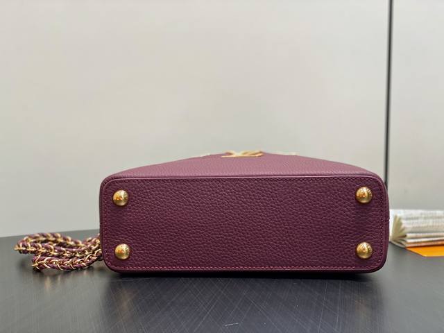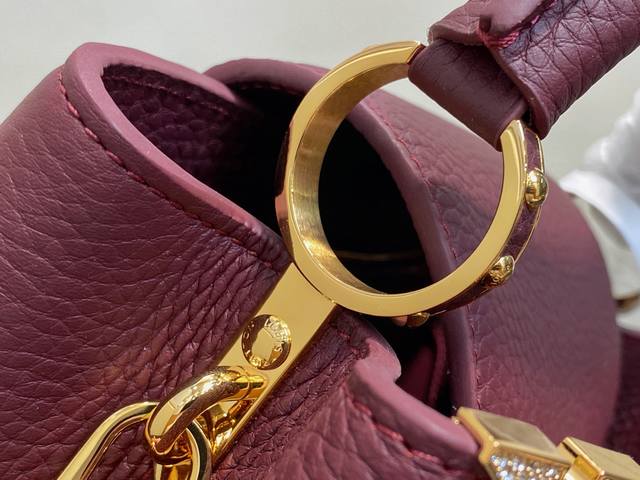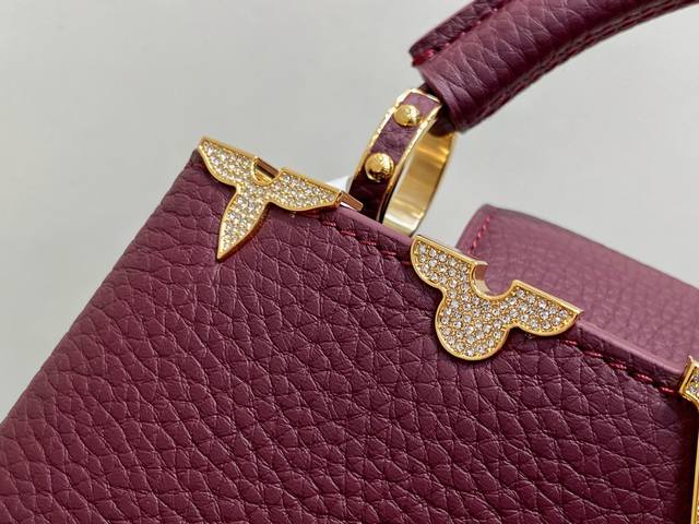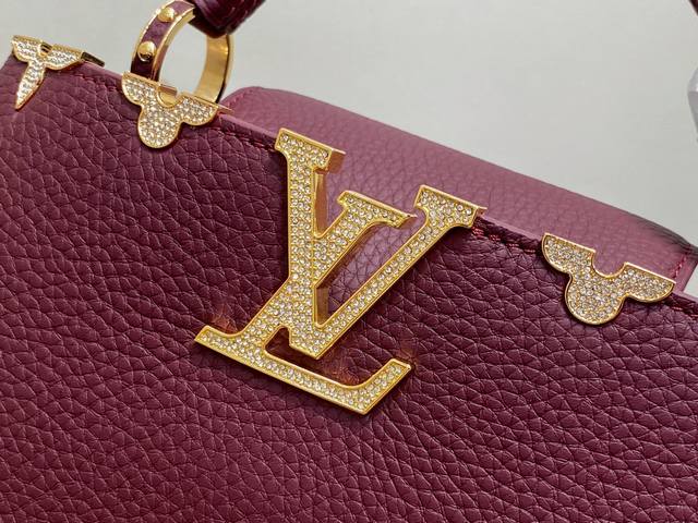 原单精品 M48865酒红拼金钻花冠款 全皮Cap那英款 Capucines Bb手袋 法国进口小牛皮,闪亮的金属饰件,特有的Capucines搭盖既可收入包内展示字母标识,又可外翻 呈现Monogram Flower图案 Size:27X18X9Cm。