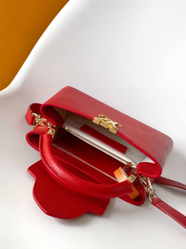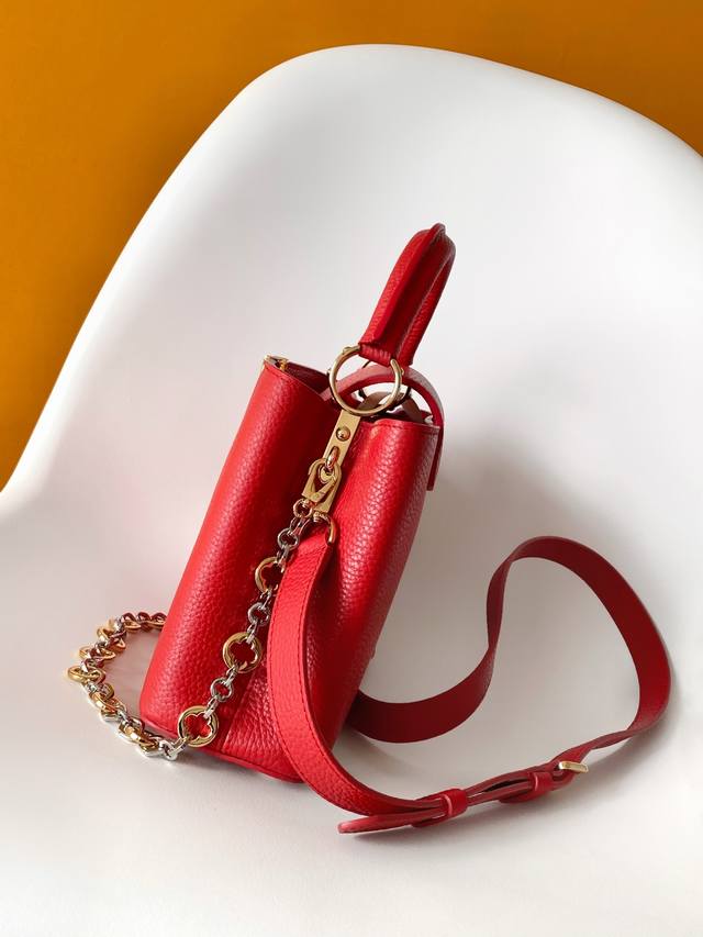 M12936黑色 M12935灰色 M12938米白 M12937红色特级原厂 动态 163本款 Capucines Bb 手袋取材柔韧 Taurillon 牛皮革,以珠宝风格双镀链条和 Monogram 花卉元素点明 Chain On You 系列身份。翻盖可置于内外两侧,充裕构型和多重内袋方便收纳日常所需,圆润 Lv 字母再添匠心细节。21.0 X 12.0 X 8.0 厘米 长 X 高 X 宽 27.0 X 17.3 X 9.0 厘米 长 X 高 X 宽