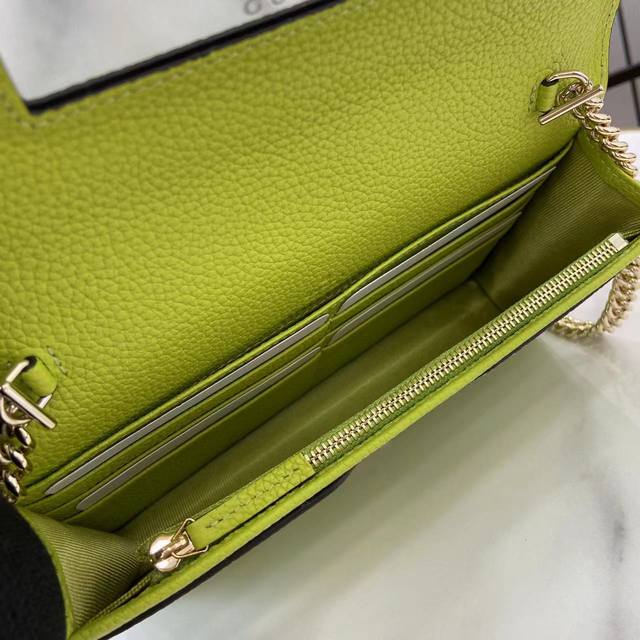 配全套原厂专柜包装 新品 这款Gg Marmont系列链带钱包选用古驰亮绿皮革,搭配米色和深棕色Gg Supreme材料制作。标志性双G配件生动点缀于挺括感包身之上。这款配饰配有可拆卸链式肩带,堪称昼夜皆宜的百搭款式。造型虽小巧玲珑,但实用性毫不逊色,内部空间井井有条,可放置卡片等必需品。古驰亮绿色皮革,搭配米色和深棕色Gg Supreme材料浅金色调配件古驰亮绿色塔夫绸衬里双G内部:6个卡片隔层、1个平口袋、1个接裆式拉链袋和1个开口隔层镜子可拆卸链式肩带 60厘米高 按扣开合重量:约0.4千克型号:4