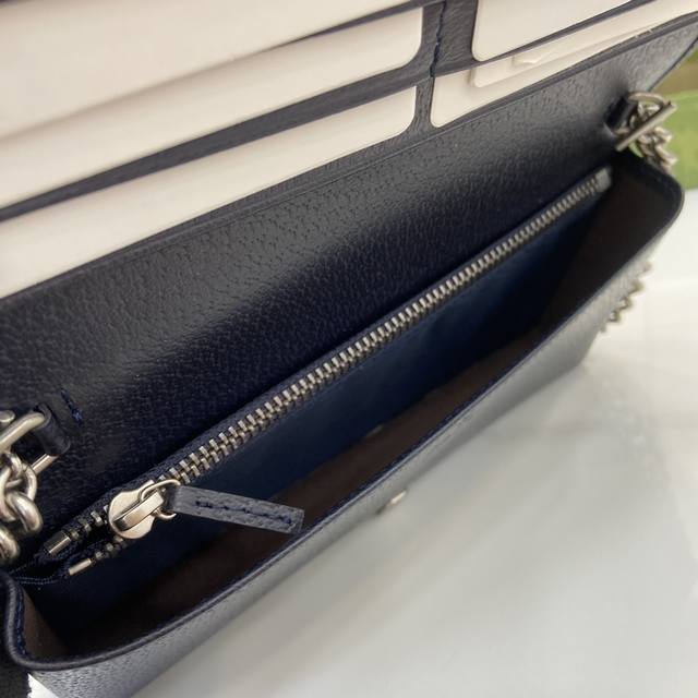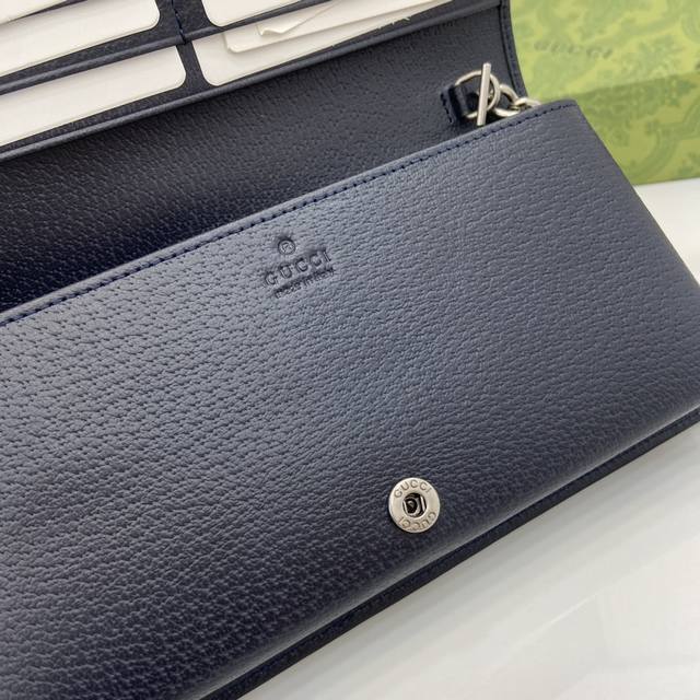 配全套原厂绿盒包装 这款链带钱包是Gucci Horsebit 1955系列配饰系列的新品,由品牌经典双G字母交织图案帆布制作而成,并运用了与该系列手袋一脉相承的双环和长条形设计。经典的翻盖式按扣造型内配数个卡片隔层和口袋,可拆卸链带打造多样化穿搭造型。蓝色皮革细节塑就别致时尚风范。蓝色 蓝色Gg Supreme帆布蓝色皮革细节金色调配件云纹织物和绒面材质衬里马衔扣细节内部:6个卡片隔层、1个平口袋、1个接裆式拉链袋和1个开口隔层1个拉链口袋一个开口袋可拆卸链带高58厘米按扣开合重量:约0.3千克型号:6