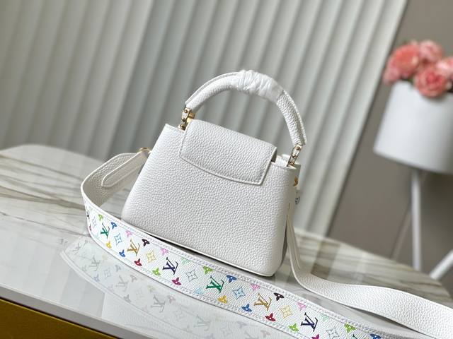 出厂价P 特级精品动态芯片M13253 M48865白拼紫三彩款本款 Capucines手袋出自路易X村上隆再版系列 选用Taurillon牛皮革妙趣演绎经典设计 Lv字母和可拆卸Monogram 肩带浸染明丽色调 致意艺术家标志性的虹彩笔触 蝴蝶结造型钥匙包和挂锁装饰再添考究细节 内隔层和多重口袋可轻松收纳日常所需 Size: 21 * 13.6 * 8 Cm