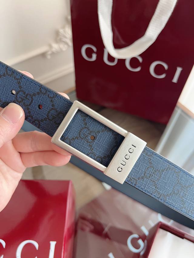 / 绝美Gucci 方扣男士新款腰帶 專櫃同步 寬3.5厘米 帶身帆布老花-拼進口硅胶底黑色 精緻真空電鍍雙G鋼扣 雙面可用