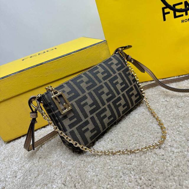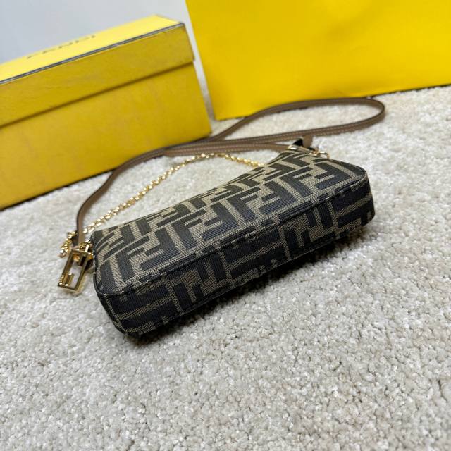 / Baguette手拿包,配有可拆卸细链条,可手拿或腋下背携。拉链开合,拉链头饰有标志性Ff图案。布料材质,带有棕色和烟叶黄提花Ff。金色饰面金属件。尺寸:20×