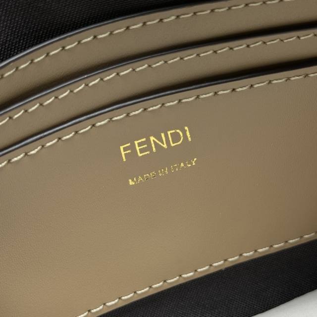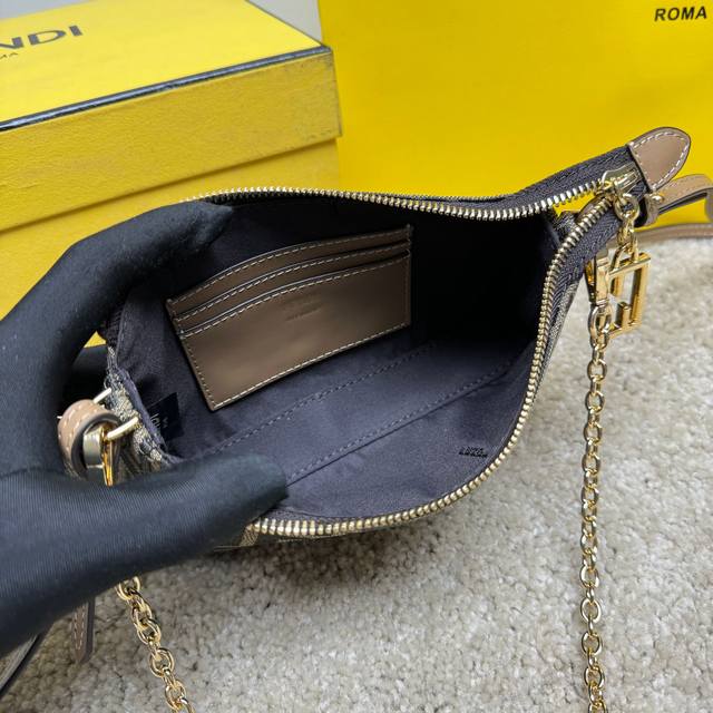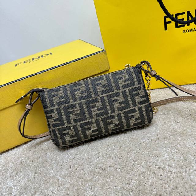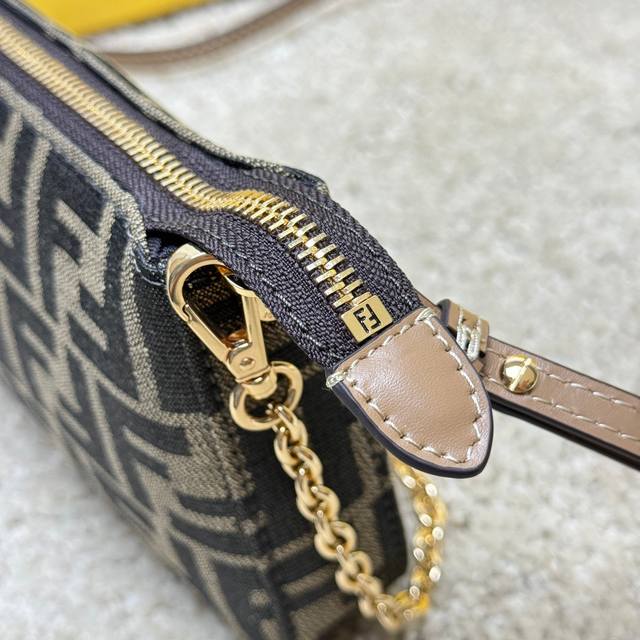 Baguette手拿包,配有可拆卸细链条,可手拿或腋下背携。拉链开合,拉链头饰有标志性Ff图案。布料材质,带有棕色和烟叶黄提花Ff。金色饰面金属件。尺寸:20×13×3Cm型号:9924老花