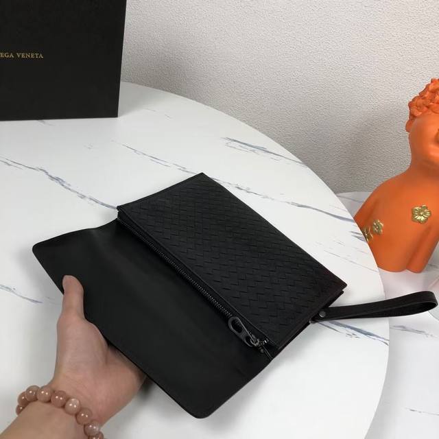 配盒子 Bv此款编织手包进口打蜡小牛皮制作,顶级做工造型纤薄轻盈,内部经过精心设计,袋口平行拉链,可折手拎带型号:8867-6#,颜色:黑色,尺寸26 18 3Cm。
