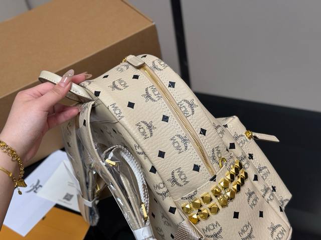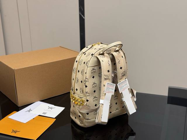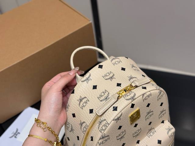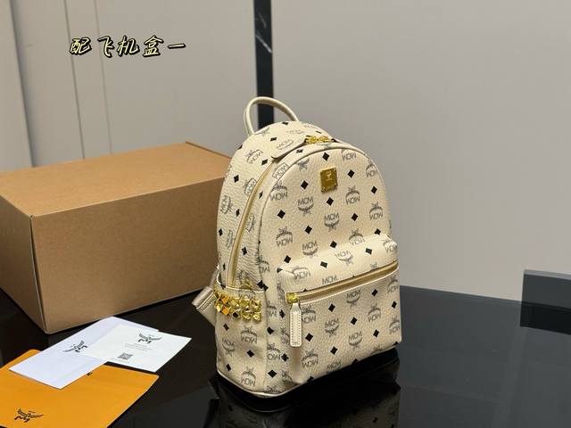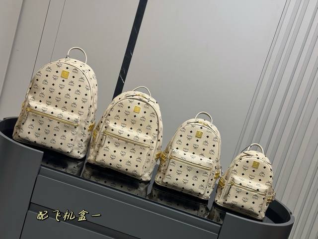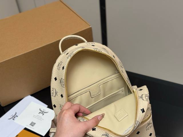 配飞机盒Mcm经典双肩包立体而自然 对花剪裁以中轴为对称中心线的上线倒向对称,十分完整完美,尤其包型 超有弧度感的!尺寸: 21*27Cm 小号 26*33Cm 中号 33*38Cm 大号 40*32Cm 超大号