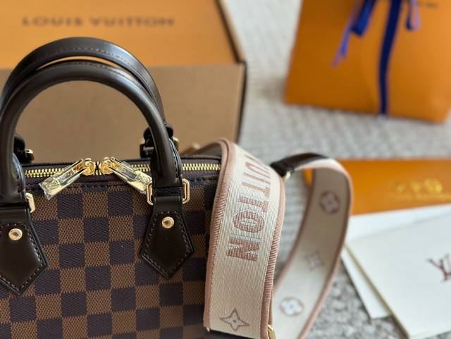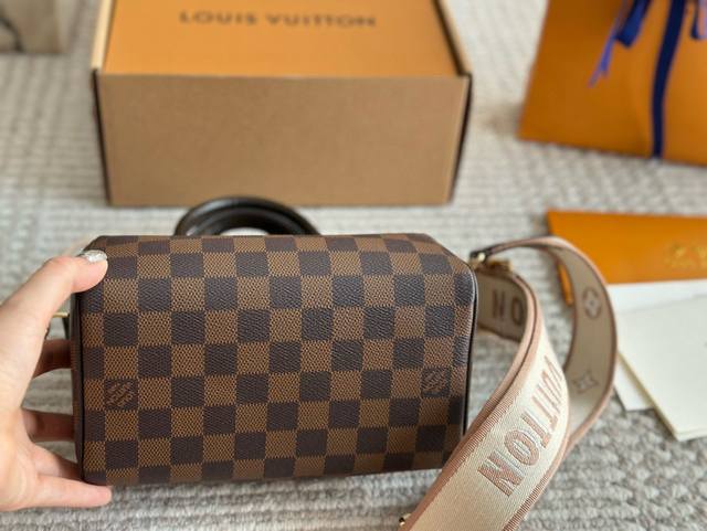 Lv女包包 路易威登Speedy N40489 本款Speedy Bandouliere 20手袋取材经典Damierebene帆布,搭配沉稳皮革饰边和织物肩带