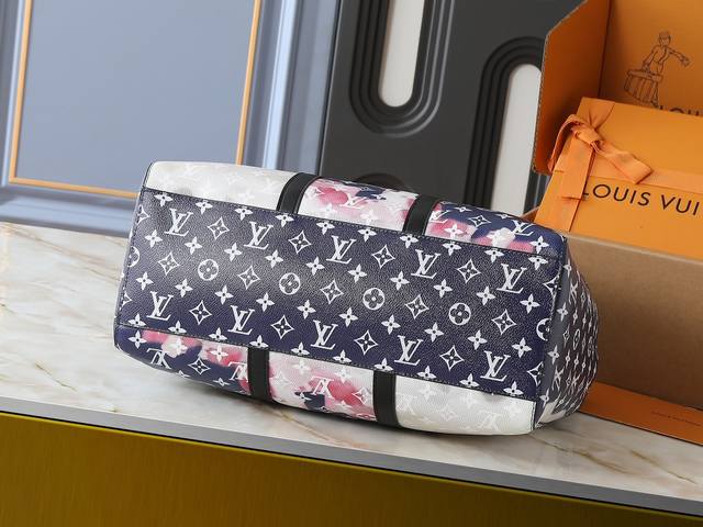 / 升级原版 M46451 M46812火焰蓝 手袋取材 手工喷绘和轻微褪色处理,随后压印 Monogram 图案。充裕容量结合平手柄和可调节肩背带。详细特征43