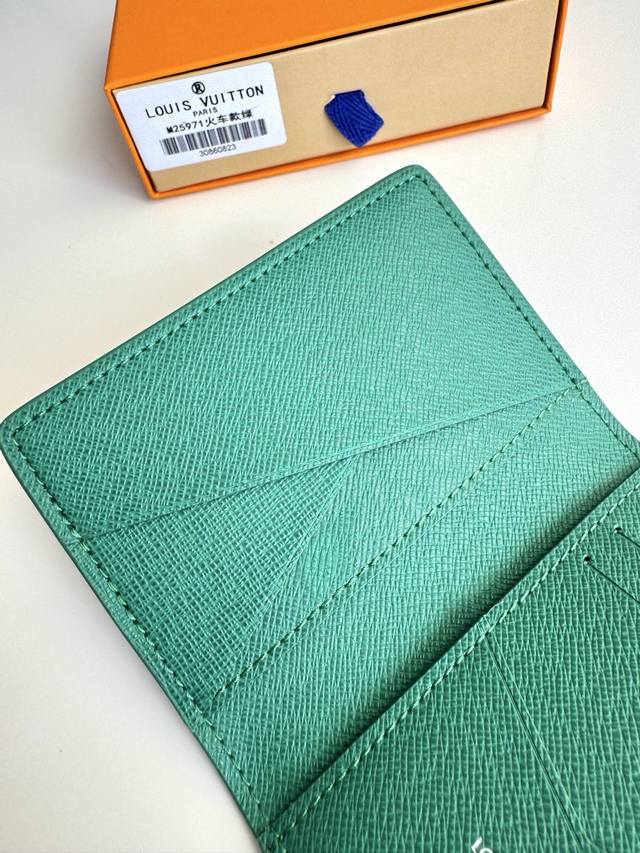 海外原单M25971火车绿色独家实拍!本款口袋钱夹以 Monogram 帆布包裹牛皮革内衬,再为缤纷和风图案融入路易威登标识,令经典设计流露别致气息。精巧构型囊