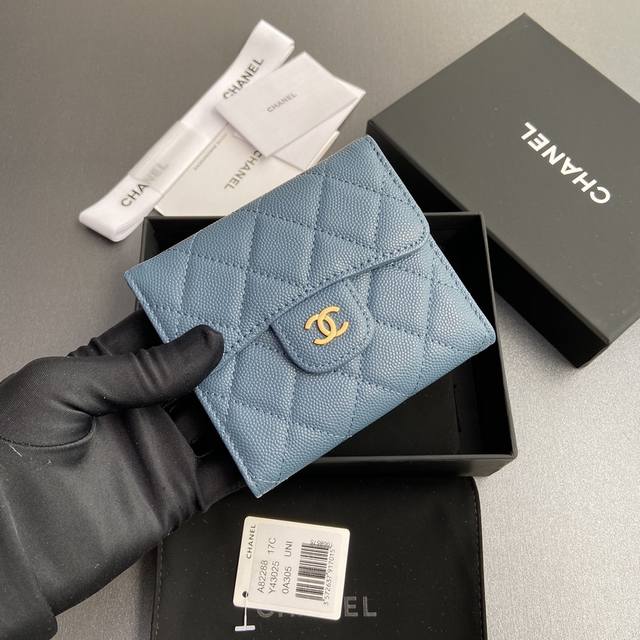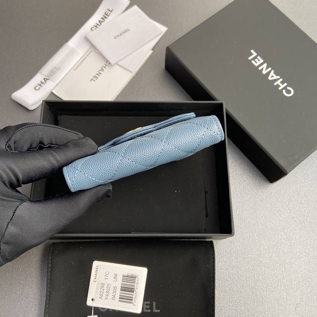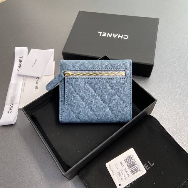 意大利進口皮 特製霧霾藍細球紋粒面壓印皮革 金色調金屬五金 6個卡片槽 1個鈔票隔層 1個零錢拉鏈袋 编号:82288 尺寸:W10.5×H11.5×D3Cm