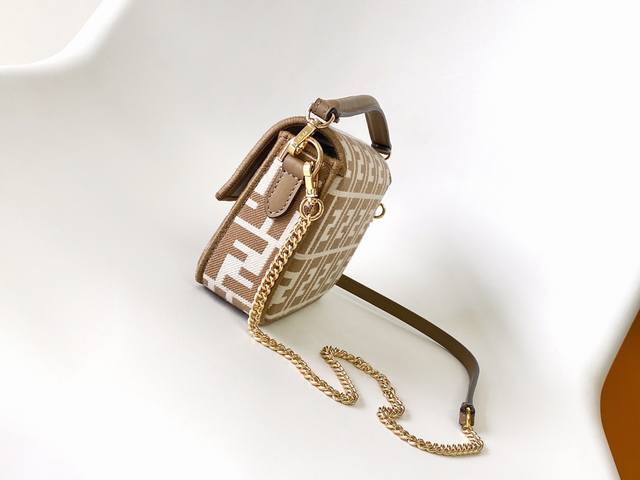 Baguette小号手袋,提花布料材质,饰有标志性Ff图案,缀以同色系刺绣饰边、搭配一个内袋和金色饰面金属件。手袋配有可拆卸式手柄和链式肩带,可手提、肩背或斜挎