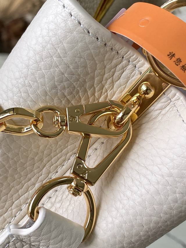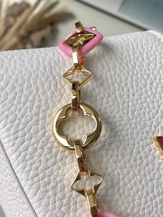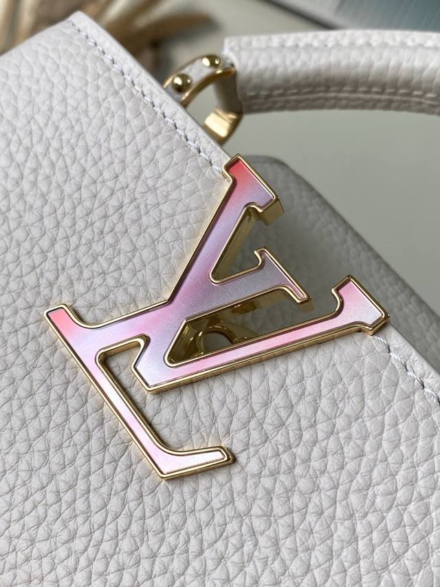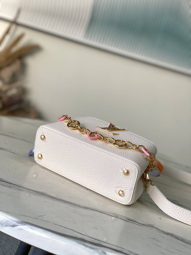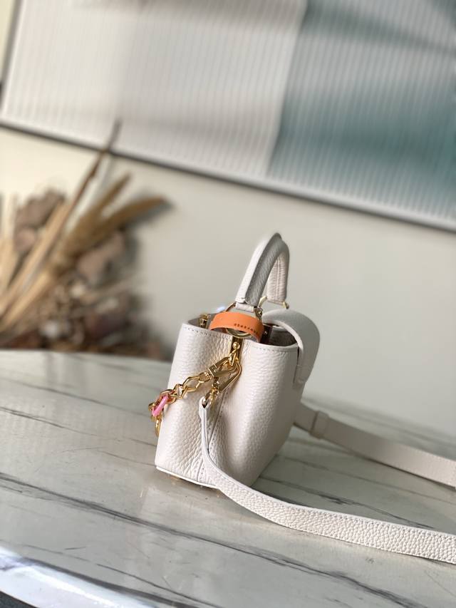 特级原厂皮 M14393 Harmony系列推出Capucines East West迷你手袋,以装饰性链条展现Monogram花卉的灵感启发。Taurillon牛皮革塑造玲构型,Lv字母演绎Puffygram珠宝系列的缤纷笔触。翻盖可内收成外置,内袋可稳妥收纳贵重物品。尺寸:22 × 12 × 8 Cm