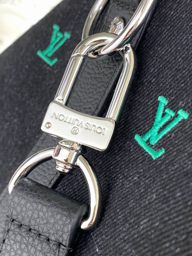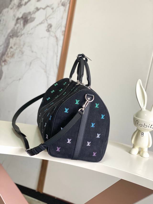 Pharrell Williams 选用深邃 Lv Blason 丹宁演绎 Keepall BandoulièRe 50 旅行袋,以敏锐通感将跃动音符化为缤纷 Lv 字母刺绣,为经典构型注入考究意味。