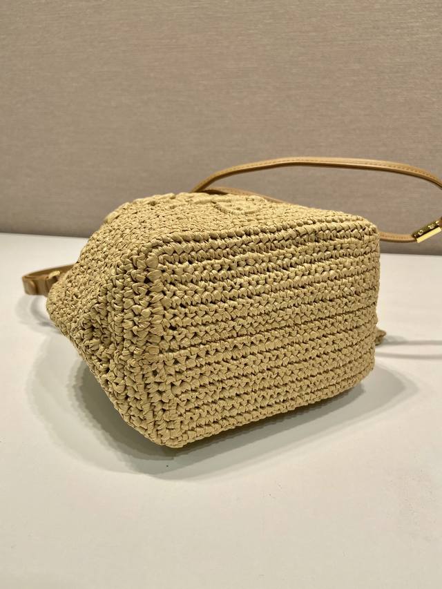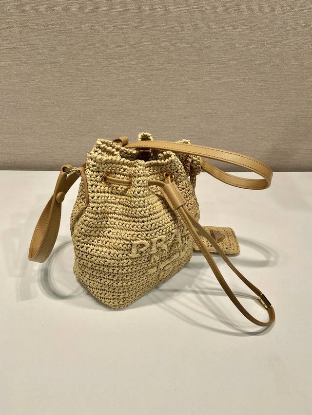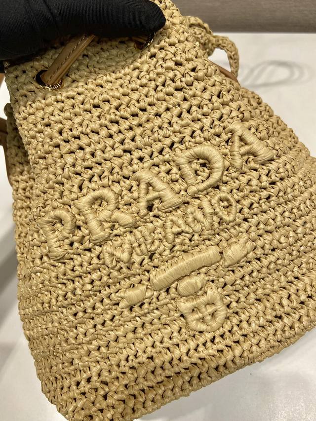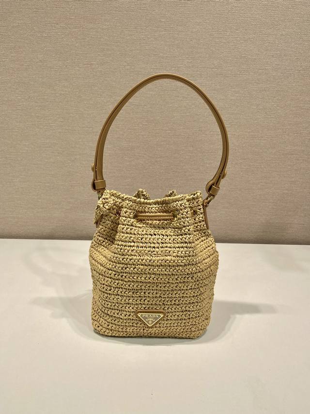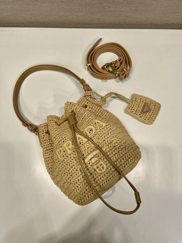 特级原厂配专柜包装草编水桶包1Be068 这款纯手工编织水桶包设计太棒了立体手工编织字体,配有长 短2条肩带,可交换。复杂手工显得格外大气 时尚,容量空间大,上