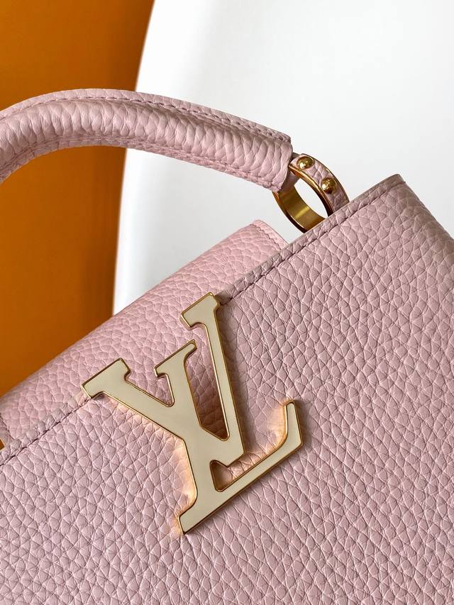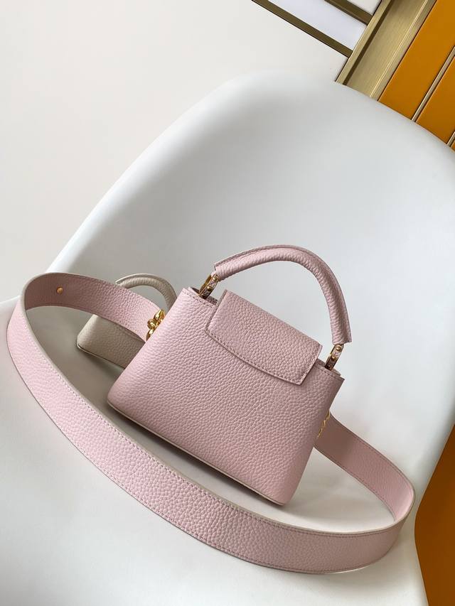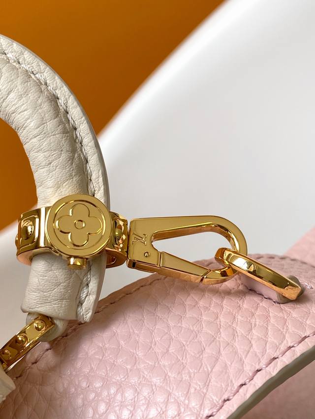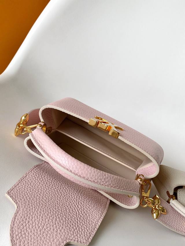 M24575蓝 M24120粉 M24563黄 特级原厂皮 动态变码本款 Capucines 迷你手袋选用 Taurillon 皮革和宛若珠宝的釉面金属件,再以相同材质和设计打造袖珍 Capucines Cutie 装饰,通过 Monogram 花卉钩扣将其固定于肩带之上。妙趣设计轻松点亮各式造型。21.0 X 14.0 X 8.0 厘米 长 X 高 X 宽