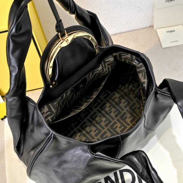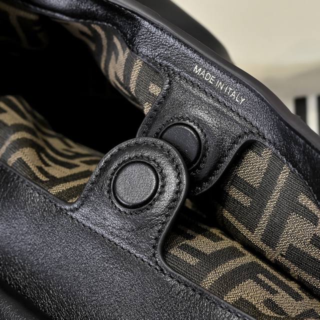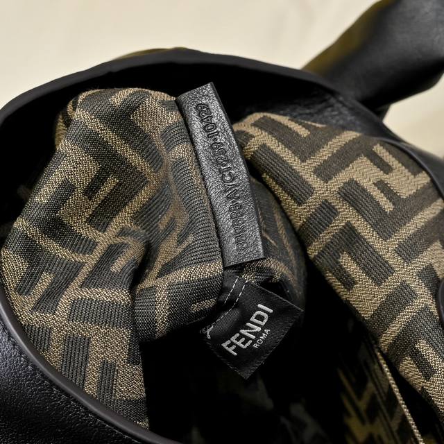 配有带卡槽口袋的烟草棕Ff提花布料衬里内隔层、可挂吊饰或钥匙圈的圈环以及金色饰面金属件。